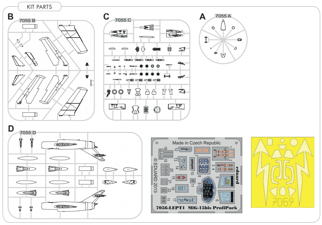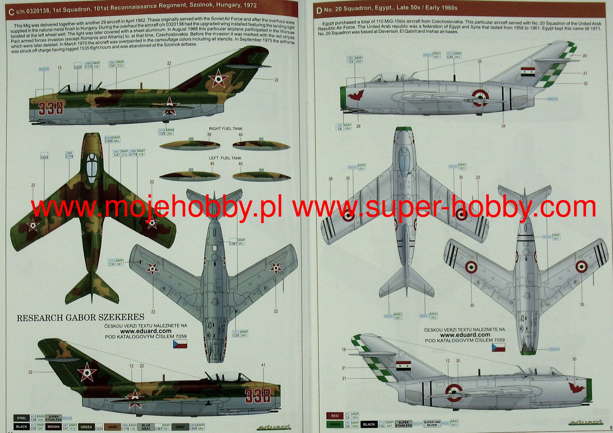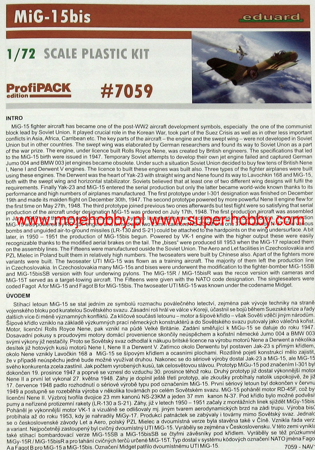 The Mikojan-Guriewicz MIG-15 is a Soviet, single-engine, wide-slant, full-metal jet fighter known by the NATO term Fagot or Midget. The flight of the prototype took place in December 1947, and the entry into the line in 1949. In total, in the USSR and under license (including Poland, as the Lim-1 and Lim-2), over 18,000 machines of all varieties and versions of the MIG-15 were created. lack of a proper engine. Only after copying the British Rolls-Royce Nene Mk.I and using it in the new airframe, it was possible to fly the future MIG 15. The basic versions are the MIG-15P (all-weather fighter), MIG-15UTI (training machine , two-seater), MIG-15SB (fighter-bomber) and MIG-15bis (fighter with the new WK-1 engine). The MIG-15 became a legendary aircraft during the Korean War (1950-1953), where it outclassed Western fighter machines until the arrival of the F-86 Saber. MIG-15 also took part in min. the Middle East conflicts (1966-1967) or the Suez crisis (1956). Technical data (MIG-15bis version): length: 10.1m, wingspan: 10.1m, height: 3.7m, maximum speed: 1075km / h, rate of climb: 50m / s, maximum range: 1310km, maximum ceiling 15500m armament: fixed - 2 NR-23 cannons, caliber 23 mm and 1 Nudelman N-37 cannon, caliber 37 mm, suspended - 200 kg of cargo. 3_edu7059_instruction_sheet.pdf