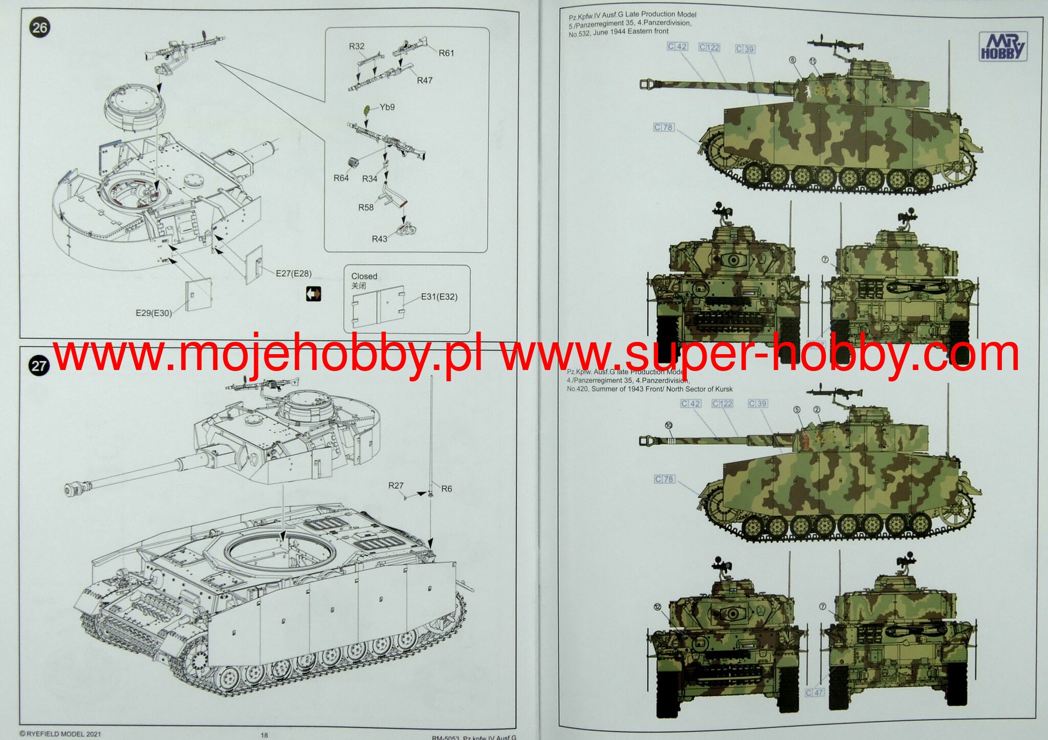 PzKpfw IV (Panzerkampfwagen IV) was a German medium tank from the Second World War. The first prototypes of the vehicle were created in 1936, and serial production continued in the period 1938-1945, ending with the production of about 8,600 vehicles. The D version of the tank was powered by a single Maybach HL 120 TRM engine with a capacity of 300 HP. It was armed with 1 75mm KwK 37 L / 24 gun and 2 7.92mm MG 34 machine guns. The PzKpfw IV was created as a result of a competition announced at the end of 1934 by the German Armaments Department for a medium tank weighing up to 18 tons and armed with a 75 mm gun. The competition was won by the Krupp company, whose vehicle was put into mass production - as it turned out, it was a vehicle that can be safely called the "workhorse" of German armored forces during World War II and one of the most intensively developed and modernized Wehrmacht tanks. Numerous variants of the PzKpfw IV were created in the course of production. Chronologically, the first was the A version, armed with a 75mm short-barreled gun and a 230hp engine. However, versions B and C appeared quickly, in which several significant changes were made: first of all, more powerful engines (265 HP in version B and Maybach HL 120 TRM with 300 HP in C version - which were installed in PzKpfw IV until 1945 year), and the armor of the entire car was improved. The F1 and F2 versions turned out to be a real revolution, in which the frontal armor was increased to 60 mm, and the main armament was changed to the great, long-barreled 75mm KwK 40 L / 43 cannon, which in 1942 and 1943 allowed them to fight any Allied or soviet. The most frequently produced versions of the PzKpfw IV were the G, H and J versions, which were very similar to the F1 and F2 versions. The main armament has not changed significantly (it was still the KwK 40 cannon), as well as the engine and chassis. On the other hand, the armor was slightly strengthened, and from the beginning of 1943 armored screens (Schurzen) were installed on them. Numerous other vehicles were built on the chassis of the PzKpfw IV, such as the StuG IV assault gun, the Nashorn tank destroyer or the Wirbelwind self-propelled anti-aircraft gun. PzKpfw IV tanks were used on almost all fronts of World War II - from the September campaign in 1939, through the campaign in France in 1940, the Barbarossa and Typhoon operations in 1941, the Battle of Kursk in 1943, to the last operations of the German army against The USSR and the Western Allies in 1944-1945.