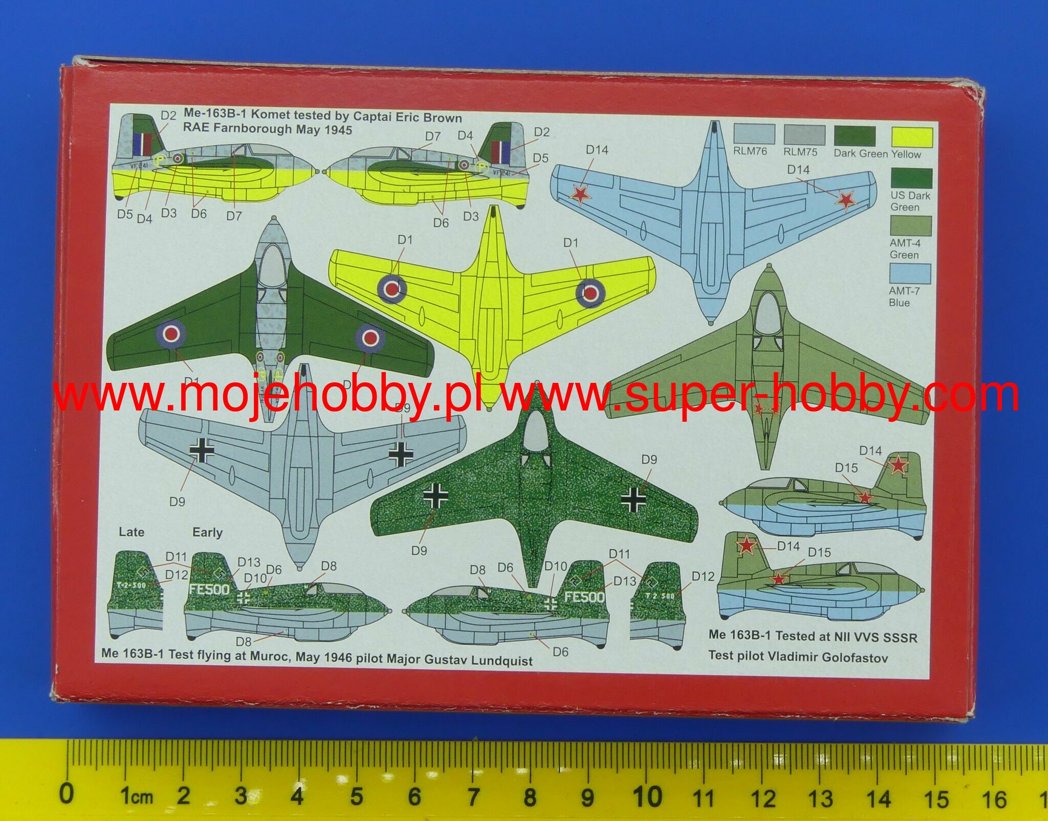 The Messerschmitt Me-163 Komet is a German rocket-powered fighter in a tailless mid-wing system with oblique wings and a mixed design. The flight of the prototype took place on February 13, 1941, but the entry into the line units took place only in 1944. The beginnings of the Me-163 date back to gliders and tailless airplanes constructed by prof. Lippisch, and especially DFS-194. It was this design that formed the basis of the Me-163A. The first flight of this machine with a rocket engine took place in 1941, and the engine was Walter HWK R.II. The following years are the time of trials and tests with a revolutionary design and the same drive. A new engine was also used - Walter HWK 109-509B-1. The first unit to fly the Me-163 was the 16th Experimental Unit, and shortly thereafter also the Group from the Jagdgeschwader 400. Their task was to develop tactics and undergo training on new machines. The first combat use took place in July 1944. Until the end of the war, these machines were used as fighters to intercept Allied bombers. In total, there were about 280 aircraft of this type in the line. The Me-163 was undoubtedly a revolutionary machine - the new propulsion and unusual shape made it a very characteristic aircraft with a considerable maximum speed, exceeding the performance of allied aircraft. However, it should be remembered that it was difficult to pilot, after landing it was completely defenseless and could operate rather from paved runways. In addition, the fuel mixture tended to self-ignite. One should also remember about the dramatically short range, which effectively limited its combat use. Technical data (version Me-163B): length: 5.98m, wingspan: 9.33m, height: 2.75m, maximum speed: 959km / h, rate of climb: 160m / s, maximum range: 100km, maximum ceiling 12,100m , armament: fixed - two 30mm MK108 cannons.