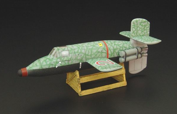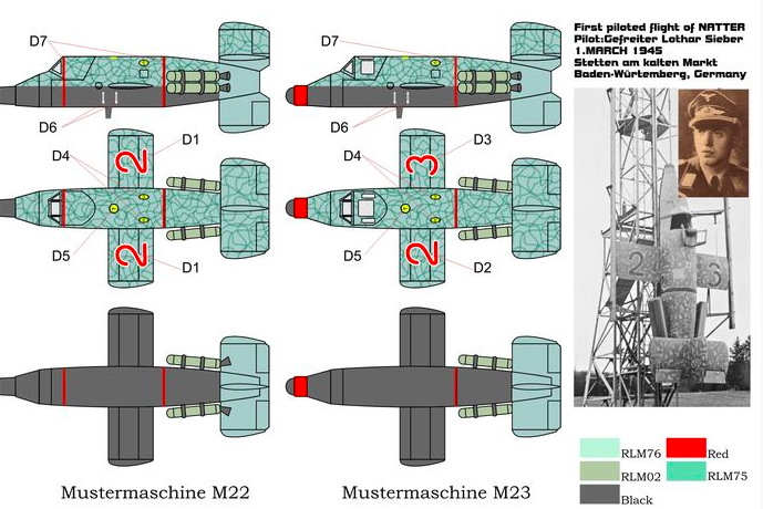 The Bachem Ba 349 Natter (viper) was a German, experimental, rocket-powered interceptor from the World War II period, intended primarily for the defense of individual objects, such as airports, military bases, etc. It was assumed that it would be used in a similar way to unmanned ground rockets -air. The take-off took place from a vertical position, from a special launcher, thanks to which these planes did not need airfields. After take-off, the machine was most of the time controlled by ground crew via radio. The main purpose of the plane was to track down the enemy bomber and destroy it with missiles. After completing the task, the pilot and the main rocket engine were to land on the ground on separate parachutes, while the wooden hull was destroyed. Only one manned test flight was carried out: on March 1, 1945. It ended with the death of Lothar Sieber, the pilot of the machine. Technical data (presumptive): Maximum speed: 1000 km / h, speed of climb: 190 m / s, maximum ceiling 12000 m, maximum range: 60 km, armament: 24 73mm unguided rockets.