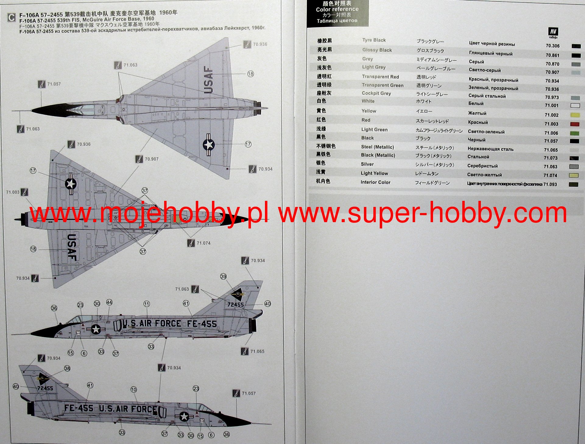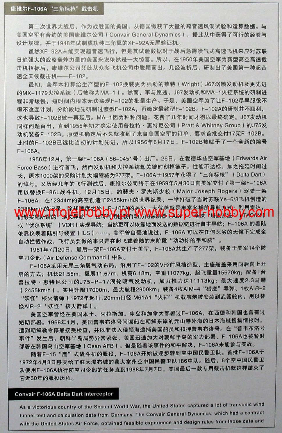 Convair F-106 Delta Dart американский одномоторный перехватчик, который ВВС США называют лучшим перехватчиком. Полет опытного образца состоялся 26 декабря 1956 г., а в линейные части машина поступила в 1959 г. Самолет изначально имел плохие характеристики, но после модификации поступил на вооружение ВВС США. Серийные F-106 были оснащены турбореактивным двигателем Pratt-Whitney J75-17 с форсажной камерой и использовали систему управления огнем Hughes MA-1. F-106 также имел камеру вооружения, которая улучшала его аэродинамические характеристики. За время службы F-106 стал самолетом, оцененным летчиками, и по сравнению с F-4 имел лучшее ускорение и аналогичную маневренность. F-106 никогда не использовался в боевых действиях и не экспортировался за пределы США. F-106 дислоцировались в основном в США, лишь небольшое их количество отправилось на базы в Германии и Южной Корее. Было создано две версии: А, то есть охотничья, и В, тренировочная, на два места. С 1972 года F-106 был заменен на F-15 Eagle в частях USAAF. Технические данные: Максимальная скорость: 2455 км/ч, скорость набора высоты: 150 м/с, максимальная высота полета: 17000 м, максимальная дальность полета: 4300 км, вооружение: стационарное одна 20-мм шестиствольная пушка М61А-1, подвесное обычно четыре Ракеты AIM-4 или одна АИР-2 Genie.