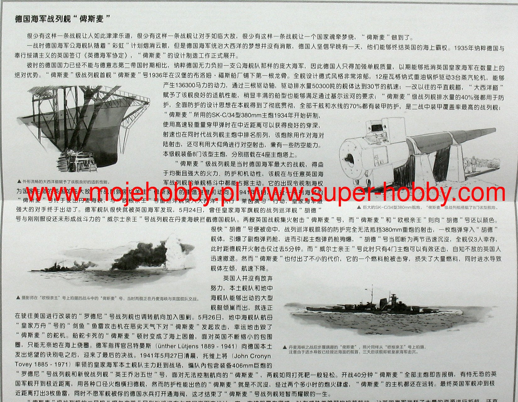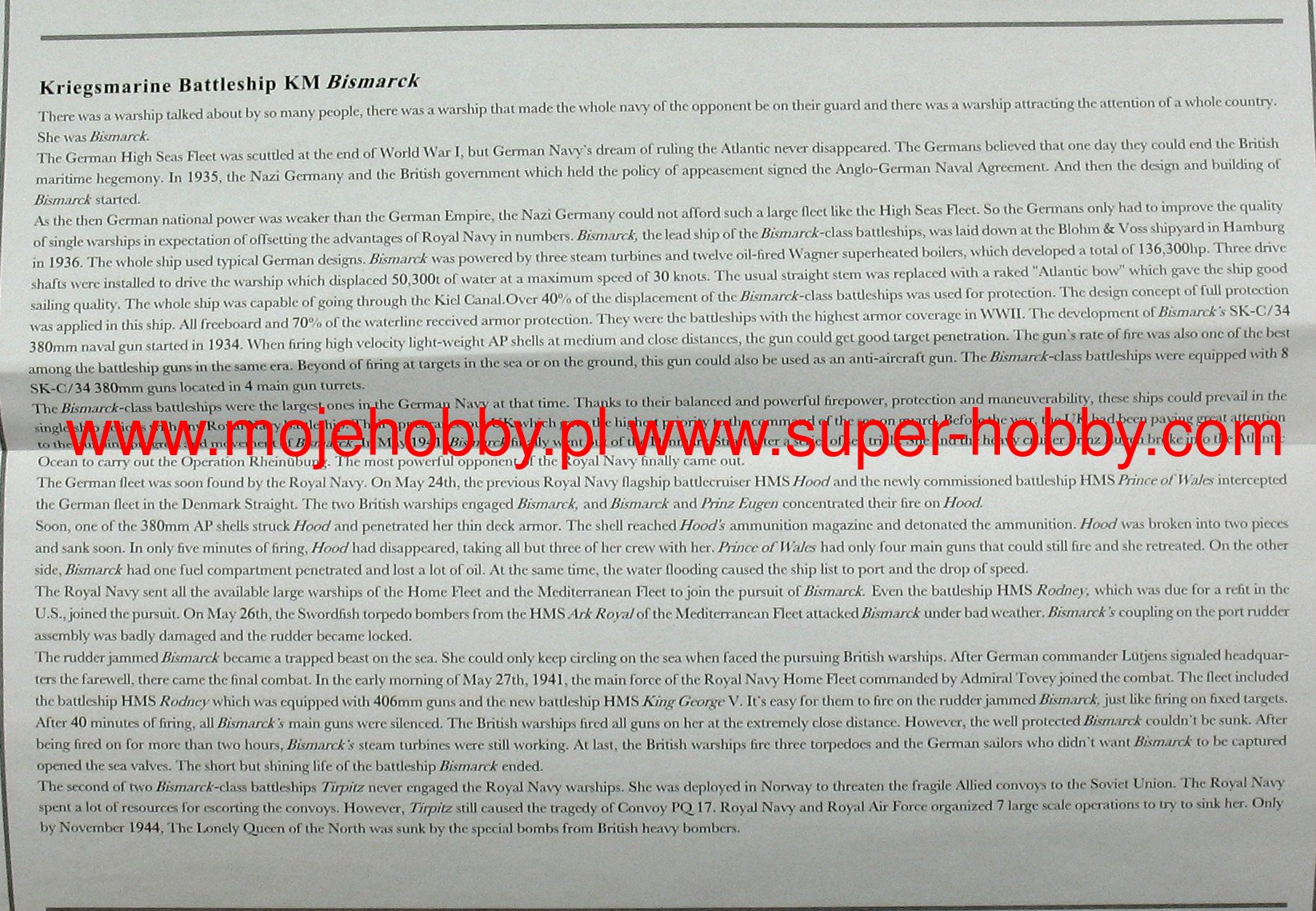 Bismarck was a German battleship, the keel of which was laid in 1936 and launched in February 1939. The battleship entered the rope service in the German Navy (German Kriegsmarine) in August 1940. The ship was 251 meters long, 36 meters wide, and had a full displacement of 53,000 tons. Bismarck's top speed was around 29-30 knots. The main armament was 8 380 mm guns in four twin turrets, and the secondary armament included: 12 150 mm guns or 16 105 mm guns. The Bismarck was the first ship of the type with the same name - the Bismarck. It was ordered to replace in line the old battleship Hannover, completely obsolete in the 1930s. At the time of launch, Bismarck was the largest German ship and the largest European battleship. It had good armor, and its main or secondary armament was inferior to its counterparts on British ships. He made his maiden voyage in September 1940, when he was ferry to Gdynia, which was to be his home port. Bismarck's combat trail during World War II was very short. Bismarck set out on its first combat voyage on May 19, 1941 - it was supposed to perform cruising operations in the Atlantic and attack primarily Allied convoys. In carrying out this plan, Bismarck, with the accompanying heavy cruiser Prinz Eugen, was already crossing the Danish Strait a few days later. On May 24, a battle took place in this strait between the German team and British ships, as a result of which the battlecruiser HMS Hood was sunk and Bismarck itself was badly damaged. After this battle, significant Royal Navy forces - including the Polish destroyer ORP Piorun - were directed against Bismarck, which the German ship tracked down and sent to the bottom on May 27, 1941. It is worth noting that there is a probable hypothesis assuming that the battleship Bismarck was self-sunk by the crew in connection with the damage sustained in combat on May 27, which made it impossible to return to the base on its own.