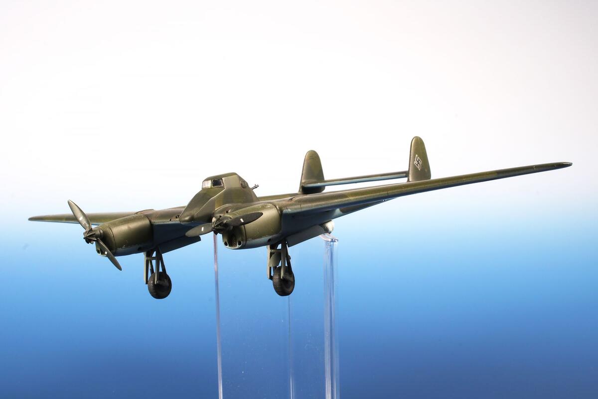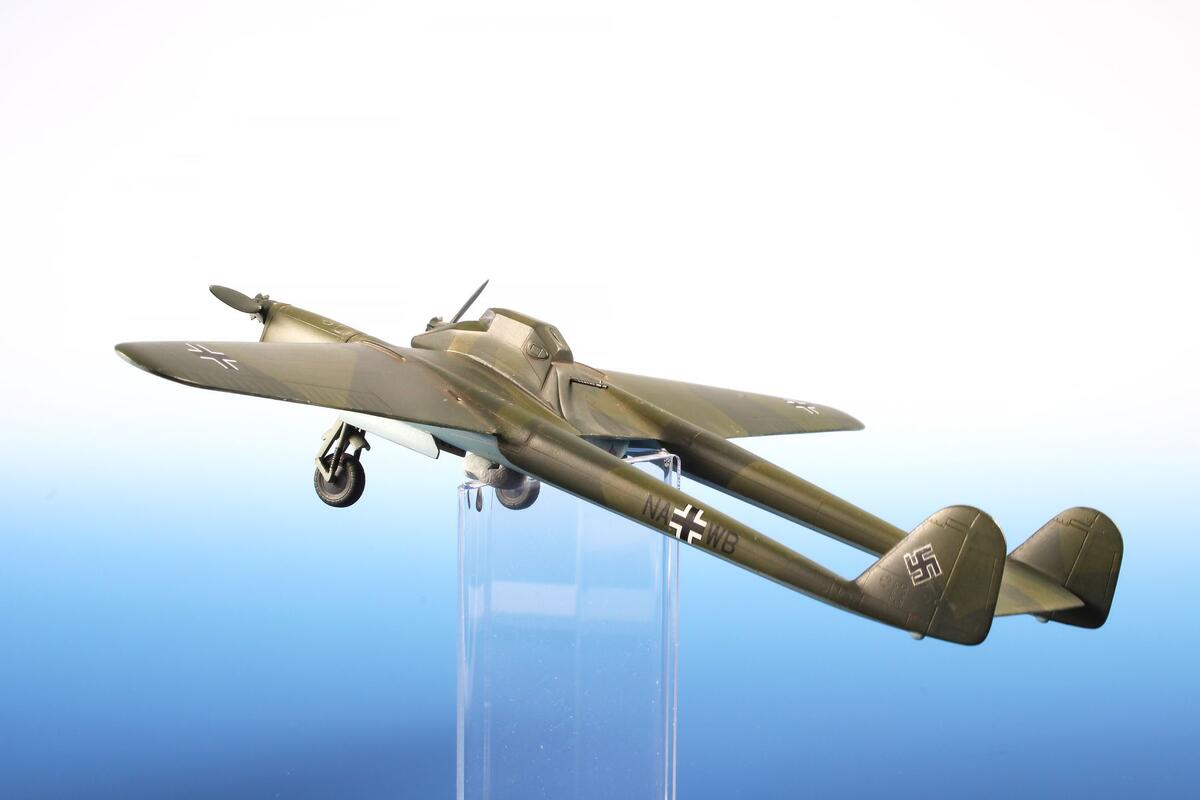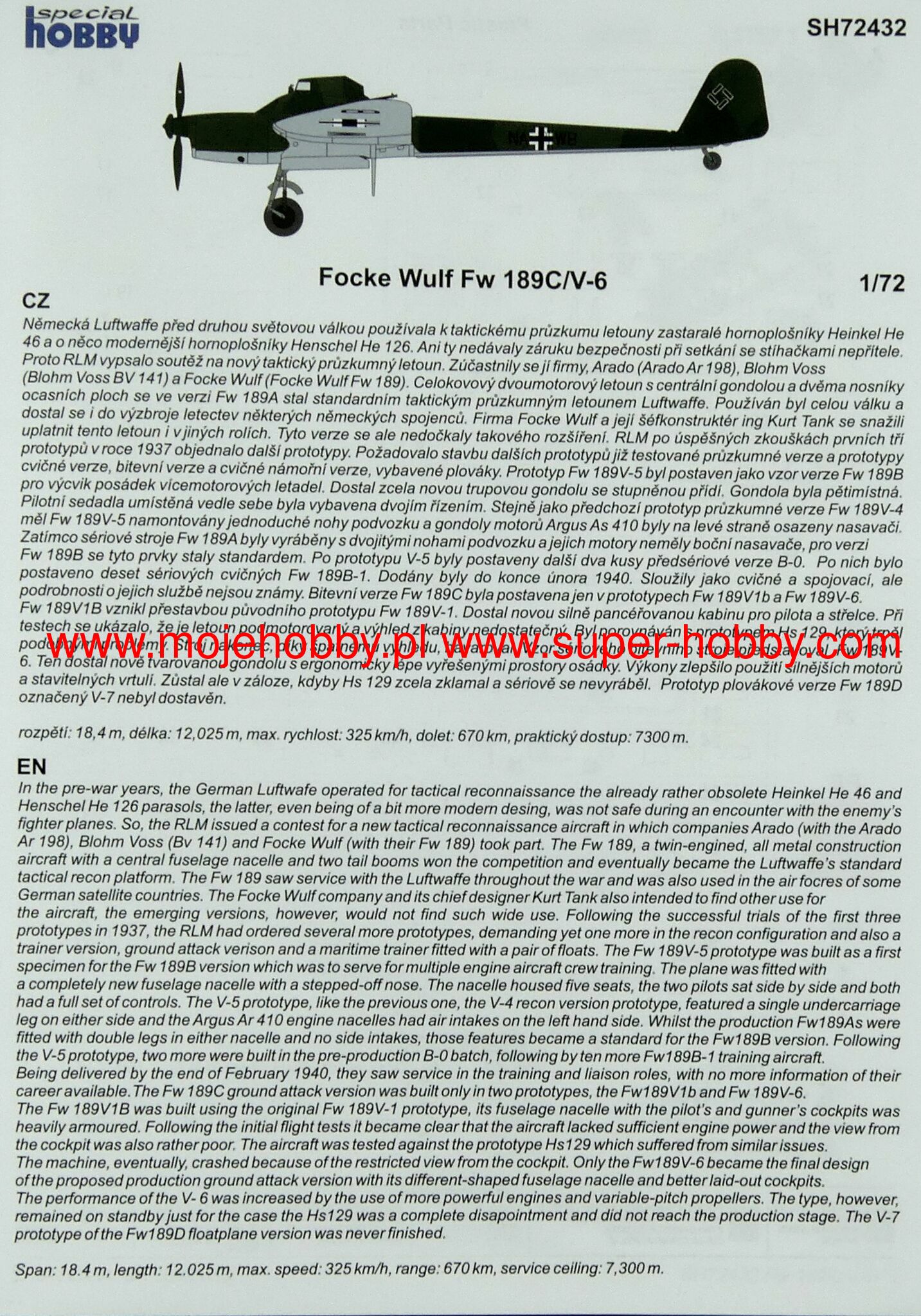 The Focke Wulf Fw-189 is a German, twin-engine, reconnaissance and military cooperation aircraft with an all-metal double-bar structure from the Second World War. The flight of the prototype took place in July 1938, and serial production began in 1940. The Fw-189 was to replace the Henschel He-126 as the main reconnaissance aircraft of the Luftwaffe. The construction of the Focke Wulf turned out to be extremely successful. Thanks to the glass cabin, it had excellent visibility in all directions, and the low minimum speed allowed for precise observation of the battlefield. The plane also turned out to be very durable and easy to use. It was also able to fly on only one engine, normally the machine was powered by two Argus As 410 A-1 with 465KM each. During the war, until 1944, several versions of the aircraft were created. Marked with the letter "A", in several versions, served only as reconnaissance. The Fw-189B, on the other hand, served as a training machine, but it was built in a minimal amount. A version of the Fw-189A-1 / R was also developed, intended to act as a night fighter equipped with the FuG-212 Lichtenstein C1 radar and a single 20mm cannon firing obliquely upwards. In total, 831 aircraft of all versions were built. The Fw-189 was used primarily on the Eastern Front. Technical data (version Fw-189A): length: 12m, wingspan: 18.4m, height: 3.7m, maximum speed: 357km / h, climb speed: 8.3m / s, operating range: 670km, maximum ceiling 8400m armament: fixed-4 machine guns cal.7.92mm, suspended-up to 200 kg of bombs.
