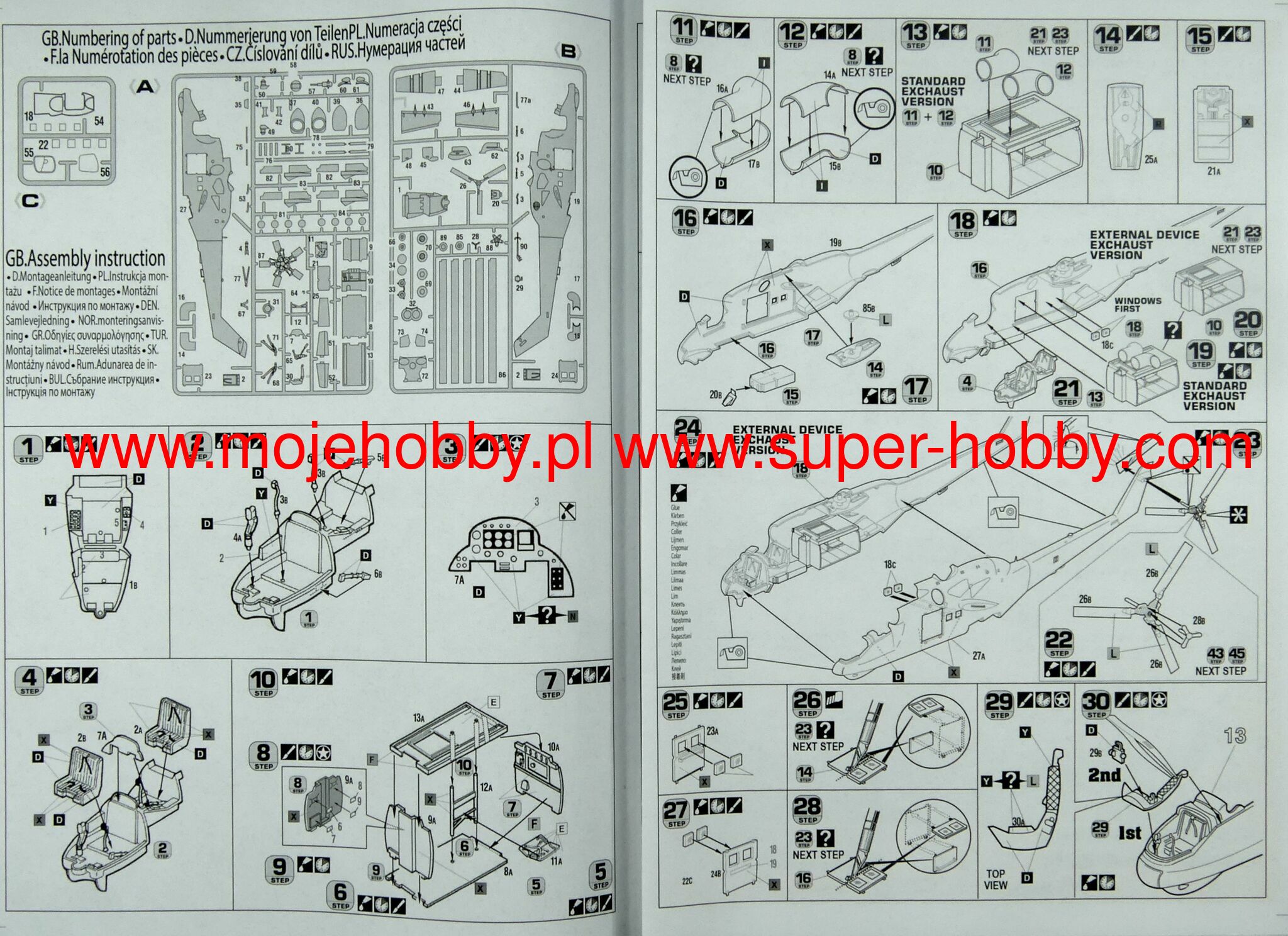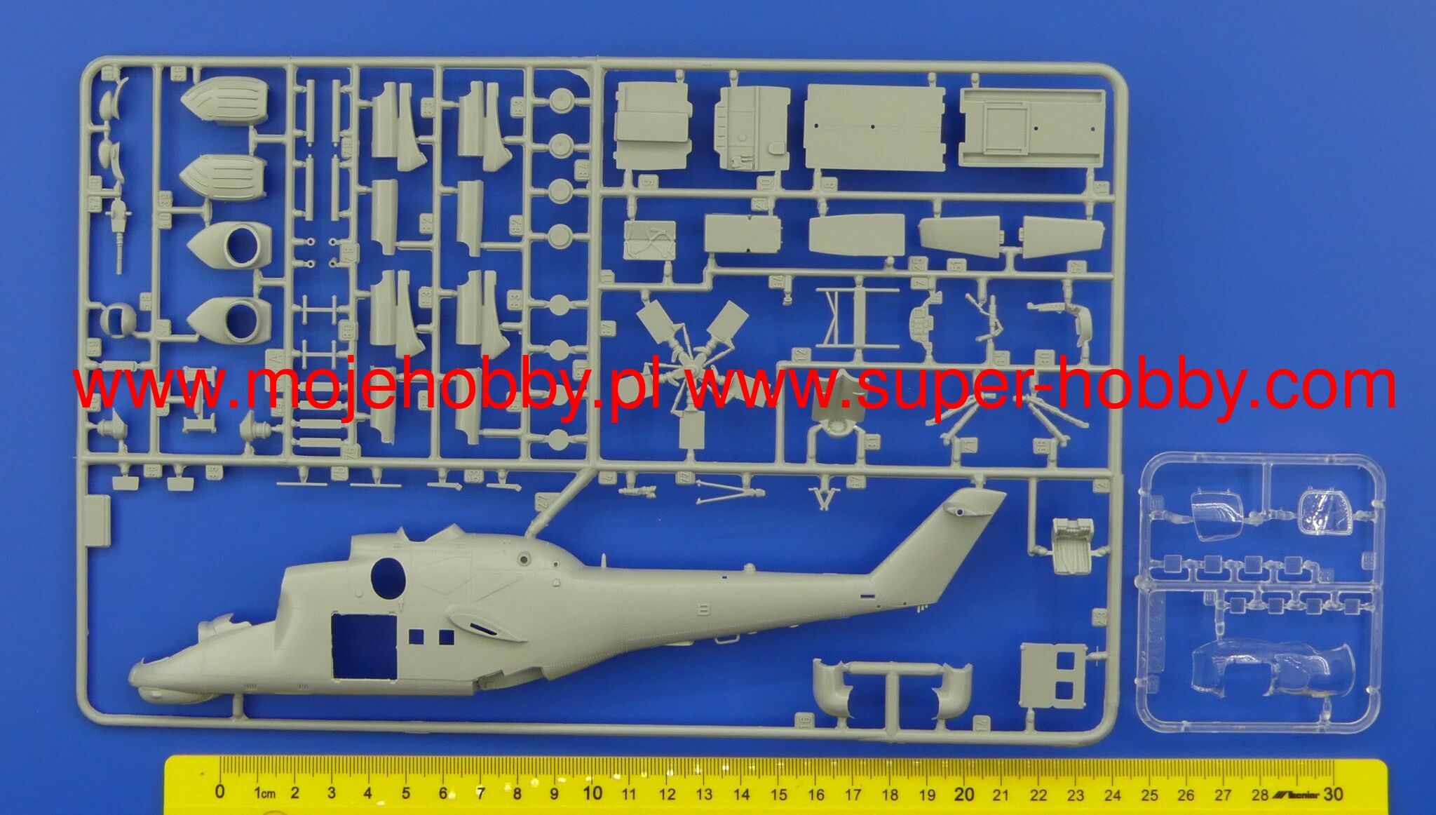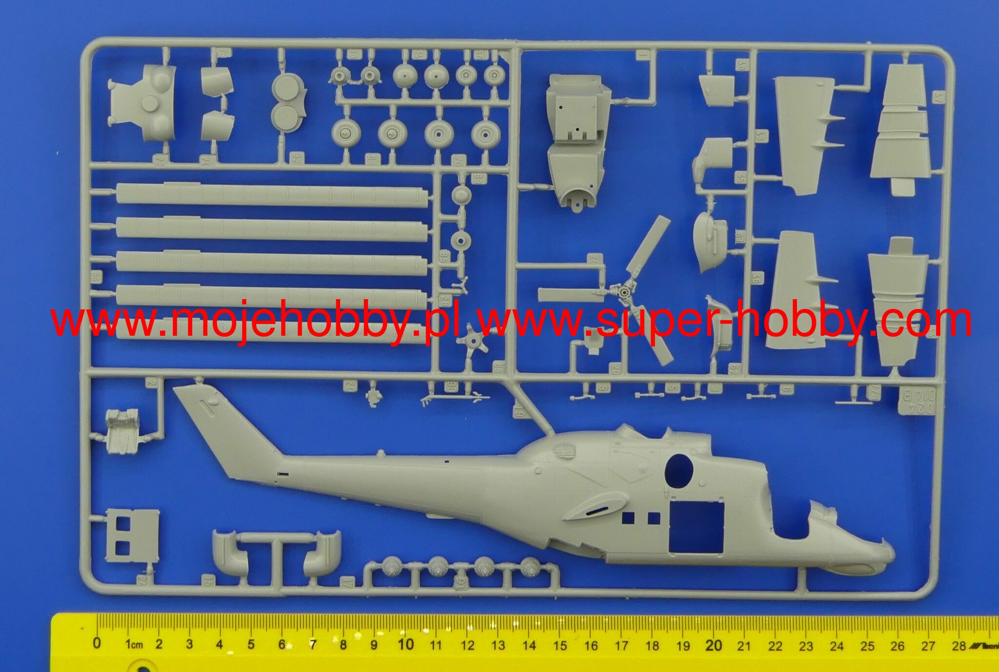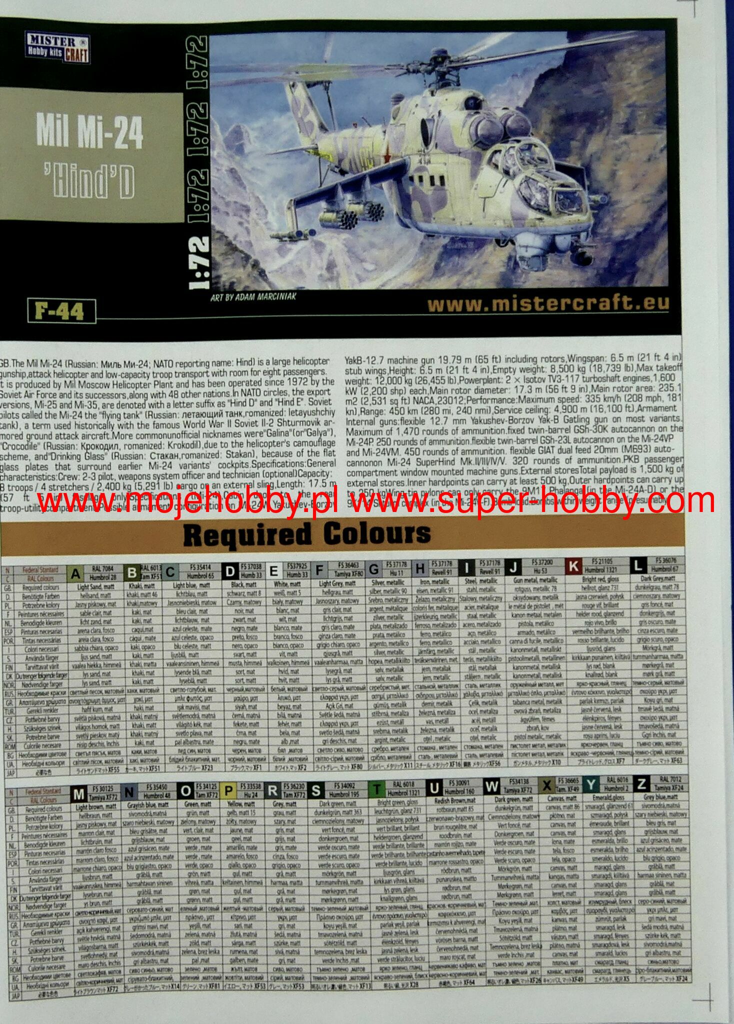 Note: Comany Mistercraft frequently changes, without any notice, the decals that come with the model, so they may differ from the photos and descriptions on our website. If you need a specific version, please let us know about that by entering the appropriate notice in the comments field when placing the order. The Mil Mi-24 (NATO code: Hind) was a heavy Soviet-made combat helicopter with a full metal, half-shell structure, with a retractable landing gear, in a classic layout with a main rotor and a tail rotor on the beam. The drive was provided by two turboshaft engines TW-3-177MT of various models, each with a capacity of 2200 HP. The first prototype flew in September 1969, and serial production lasted from 1970 to 1983. The main impulse for the development of the Mi-24 were the new tactical and operational assumptions of the Soviet Army, which began to put great emphasis on the use of attack combat helicopters in its offensive operations in the late 1960s. Originally, the Mi-8 performed well in this role, but based on its components, it was decided to create a heavily armed helicopter, faster and still capable of carrying up to 8-10 landing troops. This is how the Mi-24 was born - a machine that is revolutionary in its own way, unique in its concept and when it was put into service (early 1970s), outclassing all Western designs. A lot of modernization of the basic version (Mi-24) was created. The first chronologically was the version of the Mi-24A, in which the ergonomics of the machine was improved and more powerful engines were added. Later, the Mi-24D model was developed, which had a different cabin shape already in a tandem arrangement and a different arrangement of the tail rotor. An export version was also created, called the Mi-35. The very successful Mi-24 was widely exported to the Warsaw Pact countries, but also to Libya and Ethiopia, for example. Mi-24 helicopters took part in numerous armed conflicts, including: during the Vietnamese intervention in Cambodia, but most of all in the war in Afghanistan (1979-1989), where the Mi-24 became the "workhorse" of the Soviet troops, at the same time, high efficiency. The Mujahideen have nicknamed the Mi-24 helicopters "the devil's chariot."