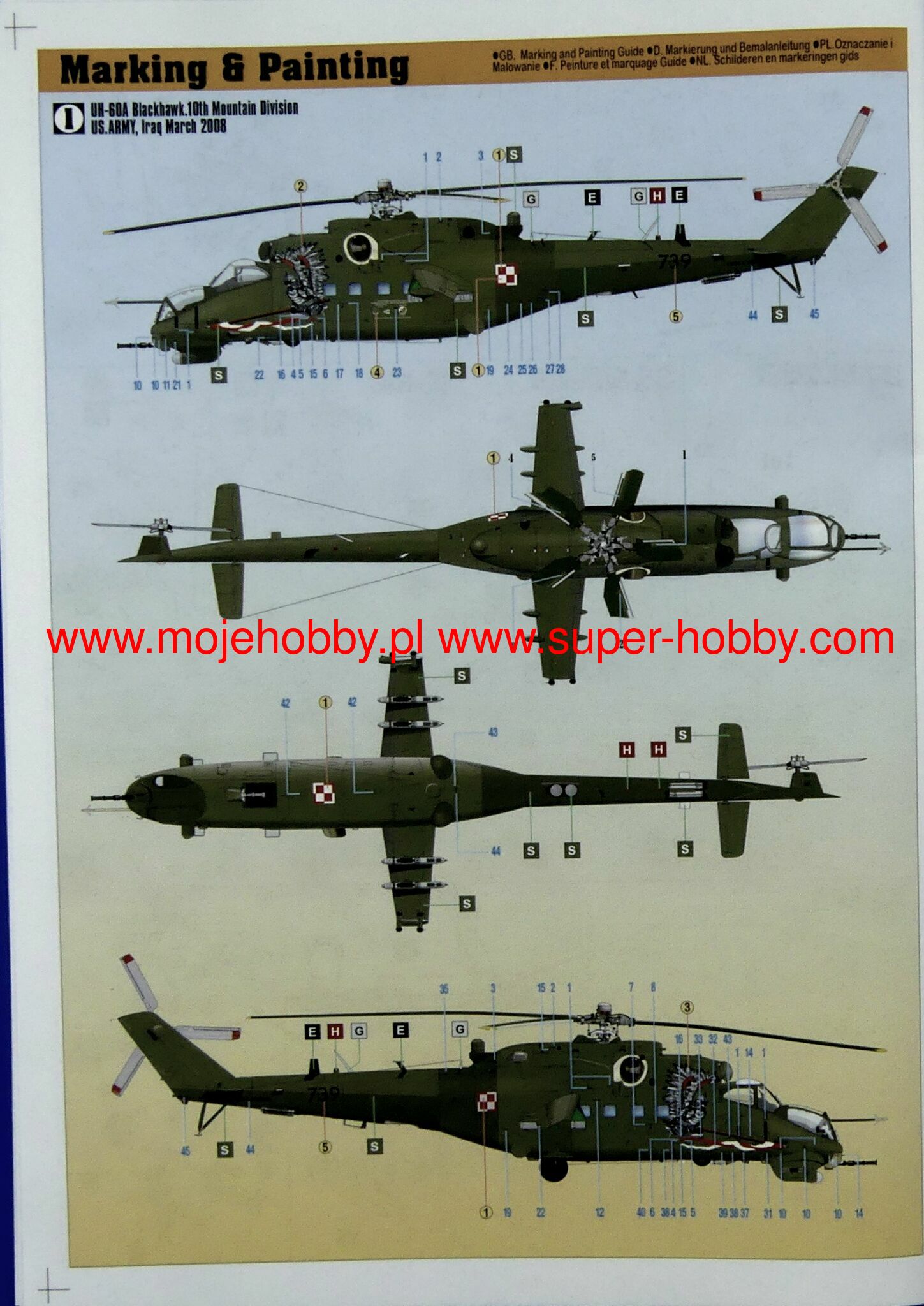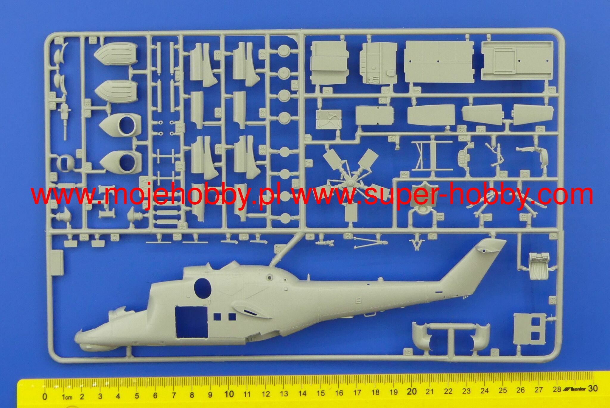 Note: Comany Mistercraft frequently changes, without any notice, the decals that come with the model, so they may differ from the photos and descriptions on our website. If you need a specific version, please let us know about that by entering the appropriate notice in the comments field when placing the order. The Mil Mi-24 (NATO code: Hind) was a heavy Soviet-made combat helicopter with a full metal, half-shell structure, with a retractable landing gear, in a classic layout with a main rotor and a tail rotor on the beam. The drive was provided by two turboshaft engines TW-3-177MT of various models, each with a capacity of 2200 HP. The first prototype flew in September 1969, and serial production lasted from 1970 to 1983. The main impulse for the development of the Mi-24 were the new tactical and operational assumptions of the Soviet Army, which began to put great emphasis on the use of attack combat helicopters in its offensive operations in the late 1960s. Originally, the Mi-8 performed well in this role, but based on its components, it was decided to create a heavily armed helicopter, faster and still capable of carrying up to 8-10 landing troops. This is how the Mi-24 was born - a machine that is revolutionary in its own way, unique in its concept and when it was put into service (early 1970s), outclassing all Western designs. A lot of modernization of the basic version (Mi-24) was created. The first chronologically was the version of the Mi-24A, in which the ergonomics of the machine was improved and more powerful engines were added. Later, the Mi-24D model was developed, which had a different cabin shape already in a tandem arrangement and a different arrangement of the tail rotor. An export version was also created, called the Mi-35. The very successful Mi-24 was widely exported to the Warsaw Pact countries, but also to Libya and Ethiopia, for example. Mi-24 helicopters took part in numerous armed conflicts, including: during the Vietnamese intervention in Cambodia, but most of all in the war in Afghanistan (1979-1989), where the Mi-24 became the "workhorse" of the Soviet troops, at the same time, high efficiency. The Mujahideen have nicknamed the Mi-24 helicopters "the devil's chariot."