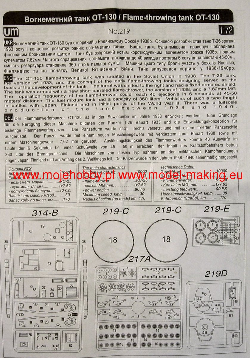 The OT-130 (another designation: KhT-130) was a Soviet flamethrower tank from the interwar period and World War II. The first prototypes of the car were made in 1938, and serial production started shortly after. The tank was powered by a single engine GAZ T-26 with 91 HP. The length of the wagon was about 4.6 meters with a width of about 2.4 meters. Car The OT-130 was constructed on the basis of the T-26 model 1933 tank. It is worth adding that the T-26 was also the basis for the development of other vehicles of this type in the interwar period. The main changes between the OT-130 and the serial T-26 concerned the main armament as well as the shape and armor of the turret. The OT-130 was armed with a single flamethrower in a rotating turret that had a range of up to 50 meters. The tank with the flammable liquid had a capacity of approx. 360 liters. The secondary armament was a single 7.62 mm machine gun. The OT-130 vehicles were used in combat during the war with Japan (1938-1939), Finland (1939-1940) and in the initial period of the German-Soviet war (1941-1945).