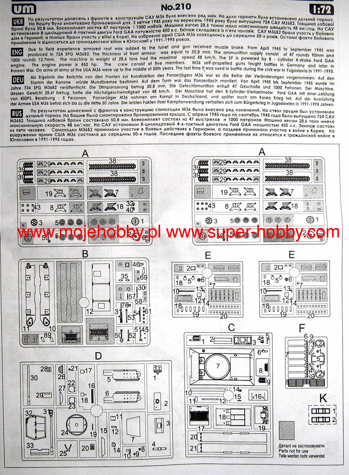 The M36 Jackson or Slugger is an American tank destroyer from the Second World War. The M36 entered combat in the second half of 1944. Despite such a late deadline, he managed to be famous for destroying a large number of enemy vehicles, especially during the German offensive in the Ardennes. Most of the design was based on the proven M10, but a typical turret was introduced that worked in conjunction with the best 90mm M3 anti-tank gun from the American arsenal of the time. Together with the newly introduced new HVAP missiles, it was able to penetrate all German armor without exception. In fact, the M36 Jackson was the only American armored vehicle capable of dealing with the German Tigers and Panthers on its own. The effect of effectiveness was high demand and production, which reached 1,400 units in less than a year. After World War II, M36 continued to be used in fighting in Korea, India's war with Pakistan, and even the Balkan conflicts. In addition to the basic version, two others were produced: M36B1 (turret mounted on the Sherman M4A3 body) and M36B2 (M10 with M36 turret and diesel engine). Technical data: length (with a barrel): 7.46m, width: 3.05m, height: 3.28m, weight 29t, engine power: 450KM, speed: 42km / h, armament: 1 90mm M3 cannon, 1 12.7mm Browning HB M2 machine gun.