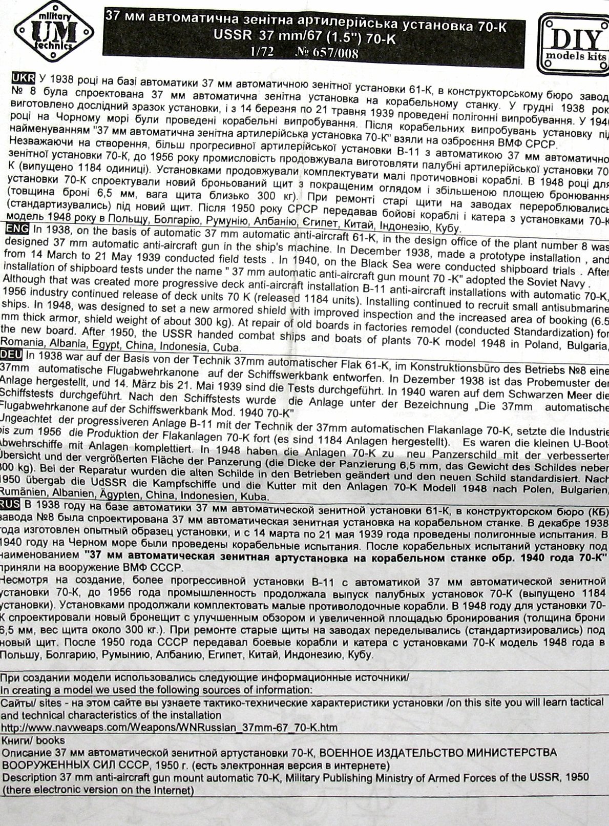 The 70-K is a Soviet 37mm naval automatic anti-aircraft gun from the Second World War. The initial velocity of the projectile fired from this gun was about 850-880 m / s, with a maximum vertical range of about 4,000 meters. The first prototypes of this weapon were created in 1938, and its adoption took place in 1940. About 1,200 guns of this type were created in the course of production. The 70-K gun was developed on the basis of the 37 mm caliber 1939 (61-K) anti-aircraft gun. The new weapon was to replace the 45 mm 21-K gun on Soviet vessels. Compared to the latter gun, the 70-K had a lower range, but had a significantly better rate of fire, and was able to fire much more modern ammunition. The 70-K gun relatively quickly became the primary light anti-aircraft weapon for Soviet ships during World War II. The production of this gun, which was reduced after 1945, continued until the mid-1950s.