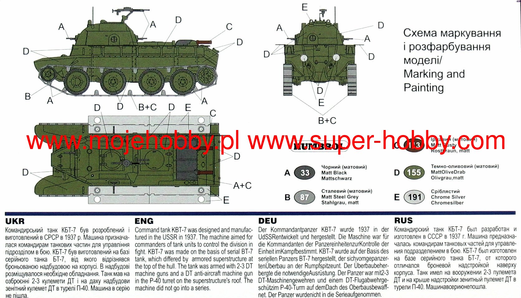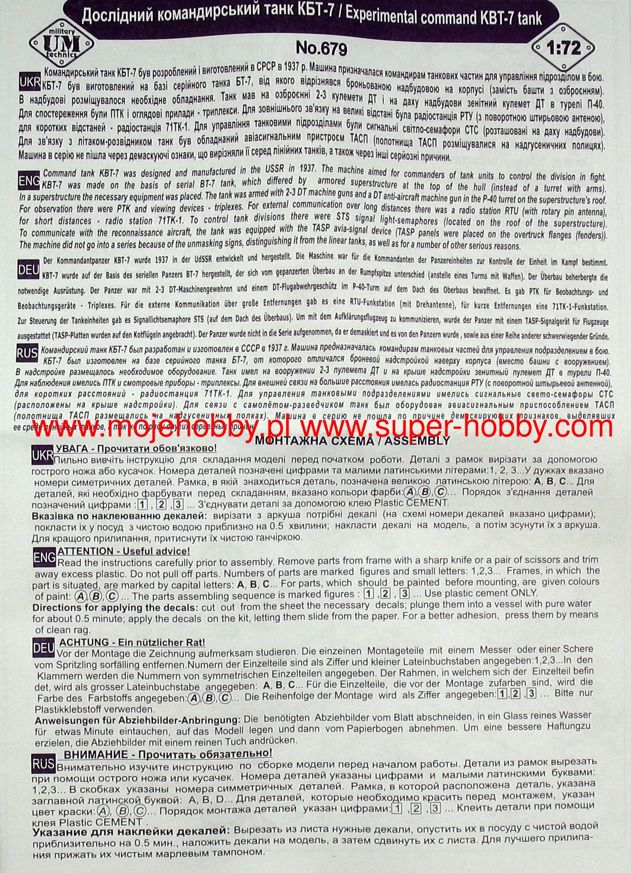 The KBT-7 was a Soviet prototype command tank from the interwar period. It is assumed that the prototype examples of this car were built in 1937. The length of the vehicle was 5.66 meters with a width of 2.29 meters. The drive was provided by a single Mikulin M-17T engine with a capacity of 450 HP. The armament consisted of 2-3 7.62 mm DT machineguns. Along with the dynamic development of Soviet armor in the 1930s, the command of the Red Army realized the need to improve the command of numerically increasing tactical unions and to increase the mobility of the commanders of these unions. The result of these needs was the development of a prototype KBT-7 vehicle, which was to be a command commander at the level of probably a division, and probably also a battalion. The vehicle was based on the standard BT-7 fast tank, from which, however, the turret with the main armament was dismantled and a special casemate was installed in its place. The vehicle also received optical instruments much better than the standard BT-7, as well as RTU and 71TK-1 radios. However, in the course of field tests, it turned out that the KBT-7 is characterized by low efficiency, the commander's compartment is too small and cramped, and the operation of radio stations closed in a too small casemate was also quite problematic. Finally, the car did not enter mass production.