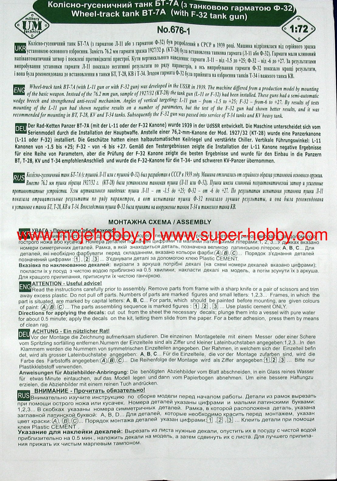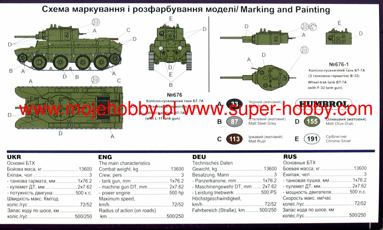 БТ-7 советский лёгкий танк межвоенного периода и начального этапа Великой Отечественной войны. Первые прототипы этой машины были построены в начале 1930-х годов, а серийное производство продолжалось с 1935 по 1940 год. Вероятно, в его ходе было создано около 5300-5500 машин этого типа. В базовой версии (БТ-7) привод обеспечивался одним двигателем М-17Т мощностью 450 л.с. Основное вооружение состояло из пушки образца 1932 года калибра 45 мм и 1 пулемета ДТ калибра 7,62 мм. БТ-7 относился к семейству быстроходных (быстроходных) танков, разработанных в СССР на базе импортного шасси и подвески Уолтера Кристи. Это позволяло этим танкам передвигаться как на гусеницах, так и на колесах. Разумеется, при движении по бездорожью максимальная скорость машин семейства БТ была очень высока намного превосходила возможности гусеничных машин. Такой вариант был и у танка БТ-7. Создавался как эволюционное развитие автомобиля БТ-5. Однако у него был больший корпус, чем у его предшественника. С 1937 года на него устанавливалась новая башня, также была усилена подвеска и улучшена трансмиссия. В конце 1939 года в производство поступила модель БТ-7М с более мощным двигателем В-2 и совершенно новой башней. Танки БТ-7 применялись в боевых действиях во время агрессии против Польши в сентябре 1939 года, а также на начальном этапе германо-советской войны в 1941 году.