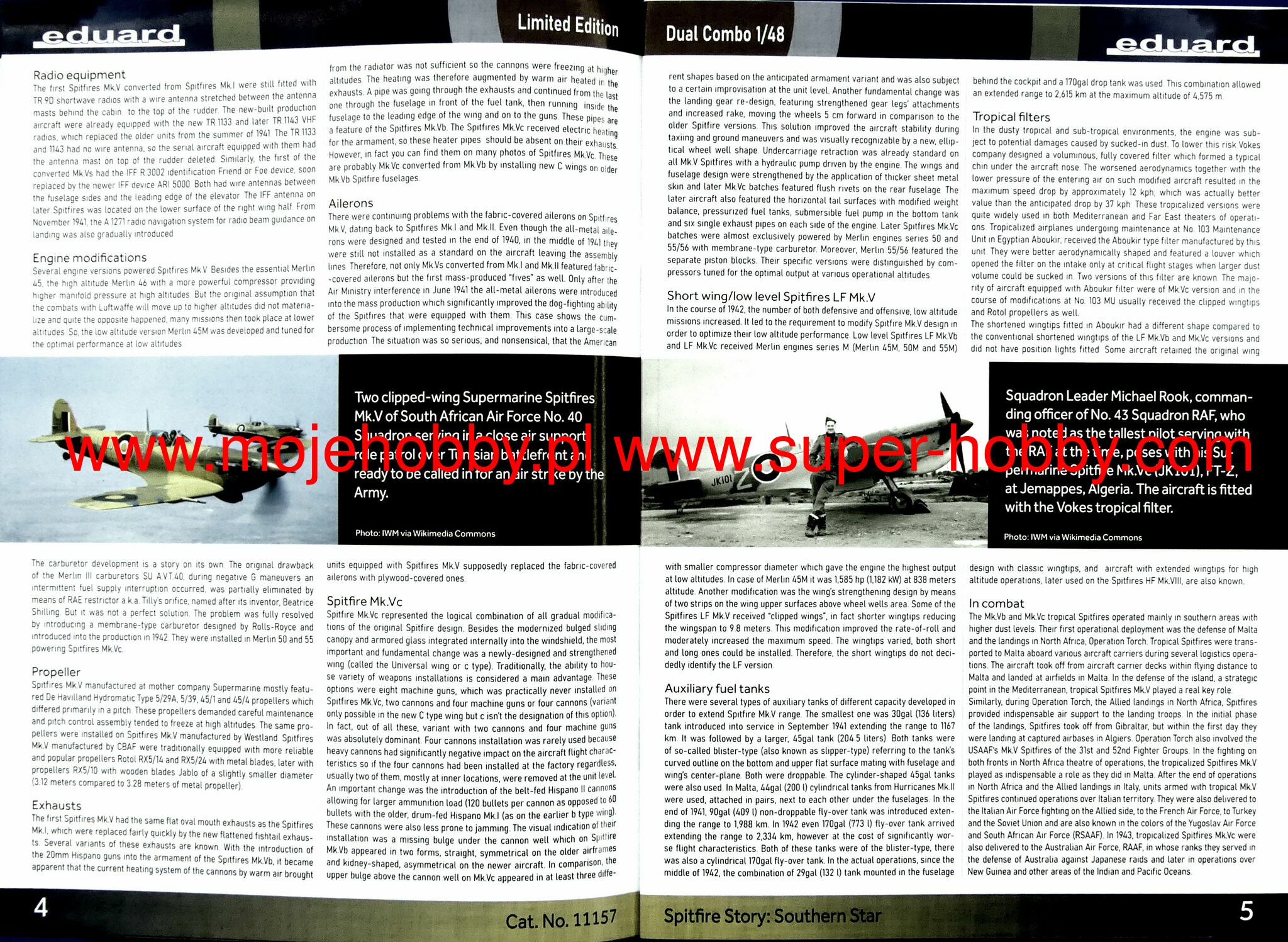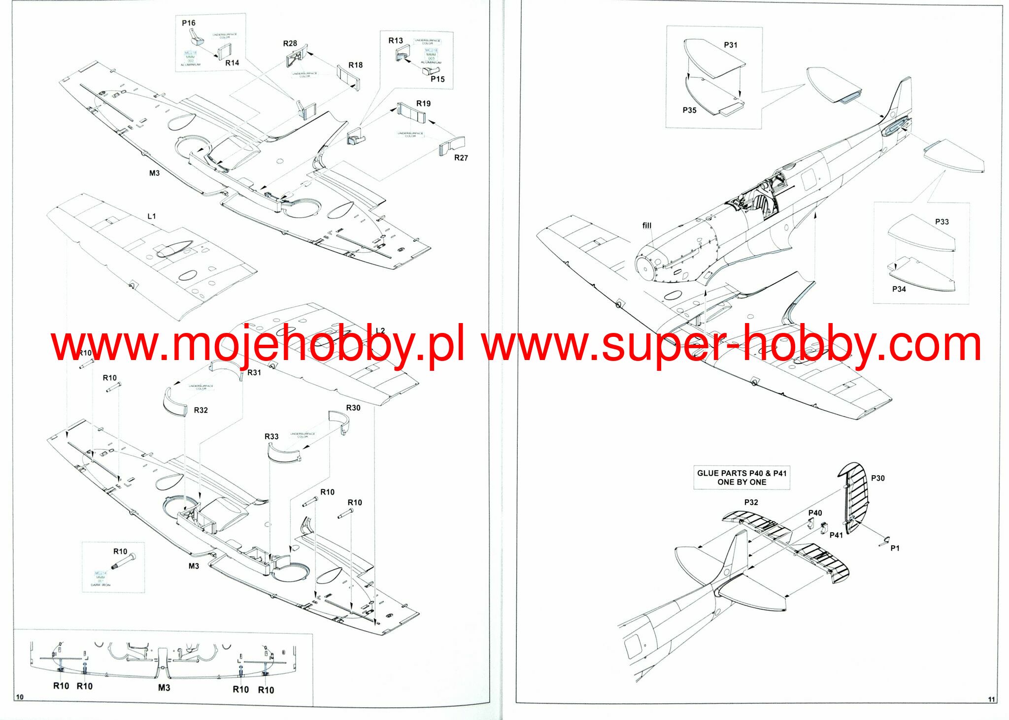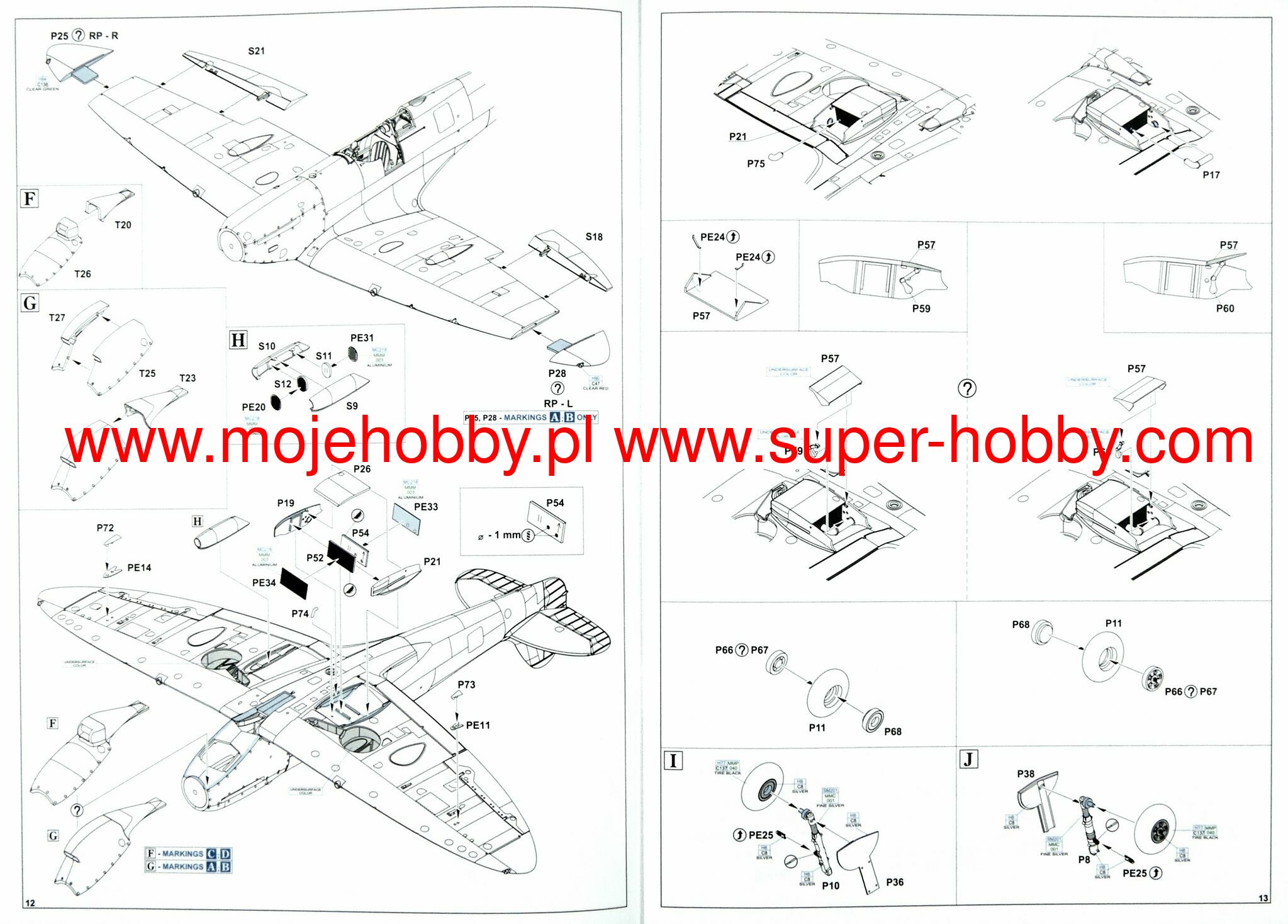 Supermarine Spitfire is probably the most famous British fighter from the Second World War. It was an all-metal machine with a low wing configuration, characteristic elliptical wings, a classic tail and a retractable landing gear. The prototype flight took place on March 5, 1936. The Spitfire proved to be the RAF's staple of the war, which continued to do well after the war, remaining in production for 10 years. The history of the Spitfire began on the drawing desk of RJ Mitchell, Supermarine's lead designer. The first machines went to RAF units in 1938, but when the Battle of Britain began in the summer of 1940, there were already 19 squadrons of modern fighters at the airfields - together with the slightly older Hurricanes of the Islands, 600 aircraft were defending. With the expansion of hostilities, the Spitfire served wherever the RAF operated in the Far East, North Africa and Italy, during the Normandy landings and fighting in France, and finally during the operation in Germany in 1945. For many Britons, he became a symbol of victory in World War II. This wonderful machine has at least a dozen production versions. The most important of them are, among others the first mass-produced Spitfire Mk.I powered by a 1030hp Rolls-Royce Merlin II engine. It was above all this machine that made such an excellent contribution to the Battle of Britain. Many versions of this model have been developed, including PR Mk IA (reconnaissance version) or PR.IG (armed reconnaissance version). Another interesting version was the Spitfire Mk.V with a Rolls-Royce Merlin 45 engine with 1440HP. Later, Merlin 50 engines were also assembled. Serial production of this version started in 1941 and was the RAF's response to the appearance of the Messerschmitt Bf-109F. Another very successful version is the Spitfire Mk.IX, powered by a Merlin 61 engine with a 4-blade propeller. It was created as an opponent to the Focke-Wulf Fw-190 and was put into production at the end of 1941. This version was modified many times and, for example, in 1944 it got a new gyro sight, an enlarged rudder or a different wing system. Another major version is the Spitfire Mk.XIV with a Rolls-Royce Griffon 61 engine and a five-bladed propeller. Serial production started in October 1943. One of the last series produced was the Mk.21 version. This version had a Griffon 61 engine, a strongly reinforced structure and sheathing, the wings were extended, increasing their flying surface. Mass production started in March 1945. Technical data (Mk.XIV version): length: 9.14m, wingspan: 11.23m, height: 3.05m, maximum speed: 717km / h, rate of climb: 18.5m / s, practical ceiling: 13,200m, range maximum: 1815 km, armament: fixed - 4 7.7mm machine guns and 2 20mm Hispano Mk II cannons, suspended - up to 225 kg of bombs. 3_edu11157_instruction_sheet.pdf