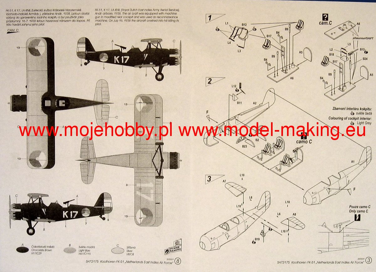 Koolhoven F.K.51 to holenderski, jednosilnikowy samolot wielozadaniowy w układzie dwupłata z poczštkowego okresu II wojny wiatowej. Oblot prototypu F.K.51 miał miejsce w maju 1935 roku, a samolot wszedł do służby w 1936 r. Samolot był wykorzystywany przez wszystkie rodzaje sił zbrojnych Holandii, służył także na terenie Holenderskich Indii Wschodnich. Samolot był napędzany wieloma wersjami silników produkcji koncernu Armstrong, Pratt-Whitney oraz Wright. W sumie powstały 142 maszyny F.K51, pełnišc do wybuchu II wojny wiatowej przede wszystkim role samolotów szkoleniowych i rozpoznawczych. 22 maszyny sprzedano potajemnie do Hiszpanii, siłom republikańskim. Lwia częć F.K.51 została zniszczona przez Luftwaffe w maju 1940 roku. Dane techniczne: Prędkoć maksymalna: 235 km/h, pułap maksymalny 5600 m, zasięg maksymalny: 730 km, uzbrojenie: stałe-2 karabiny maszynowe 7,9mm. Co oprócz modelu będę potrzebować do jego sklejenia?
