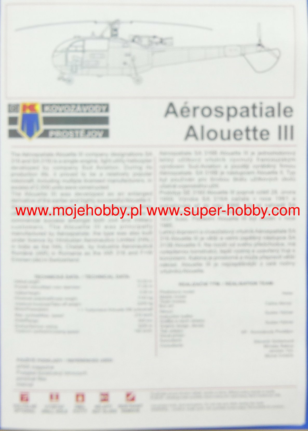 Aerospatiale Alouette III was a light, multi-role French-made helicopter. A prototype flight took place in 1959, and the machine entered production in 1960. More than 2,000 helicopters of this type, of all versions, were built in its course. The drive, in the basic version, was provided by a single engine Turbomeca Artouste IIIB with 570 HP. The length of the helicopter was 10.03 meters, with a main rotor diameter of 11.02 meters. The maximum take-off weight was 2,200 kilograms. The Aerospatiale Alouette III was created as a far-reaching development of the very successful Alouette II machine. Compared to its predecessor, however, it was clearly larger, as the drive used more powerful engines. It was also able to carry more people or cargo and had slightly better aerodynamic properties. Several versions of the helicopter were created in the course of production, among them: SA-316A Alouette III (basic version), SA-316B (version with improved transmission and greater take-off weight) or SA-319B (version powered by the engine Turbomeca Astazou XIV). Helicopter Aerospatiale Alouette III was quite commercially successful and has been or is still operated by countries such as Argentina, Austria, France, Ethiopia and Cameroon.