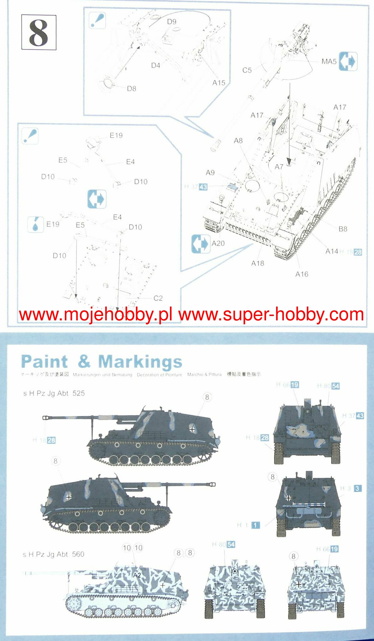 Sd.Kfz 164 Nashorn (немецкий носорог) был создан в 1942 году как истребитель танков и средство от угрозы, исходящей от немецких советских панцерваффе Т-34. Это рассматривалось как временное решение, особенно учитывая фатальную броню и очень высокий силуэт машины. Однако прослужил до конца войны как на Восточном и в Италии, так и на Западном фронте. Эти недостатки компенсировались в основном очень эффективной 88-мм противотанковой пушкой PAK43/L71. Он был способен уничтожить любые союзные или советские танки (может быть кроме ИС-2) на дистанции 2000-2500м, а неофициальный рекорд - уничтожение вражеского танка с дистанции 4600м! Мировое количество произведенных автомобилей Hornisse было ограничено 494 единицами и в основном было сосредоточено на заводах ALKETT. На протяжении всей войны машины комплектовались Schwere Panzerjager Abteilung 560, 655, 525, 93, 519 и 88. Технические данные: длина (со стволом): 8,44 м, ширина: 2,95 м, высота: 2,65 м, масса 24 т. , мощность двигателя: 296КМ, скорость (по дороге): 42 км/ч, вооружение: 1 пушка ПАК43/L71 калибра 88мм и 1 пулемет MG34 кал.7,92мм.