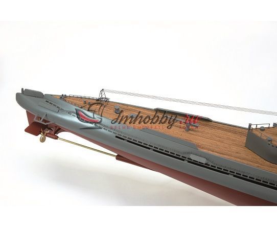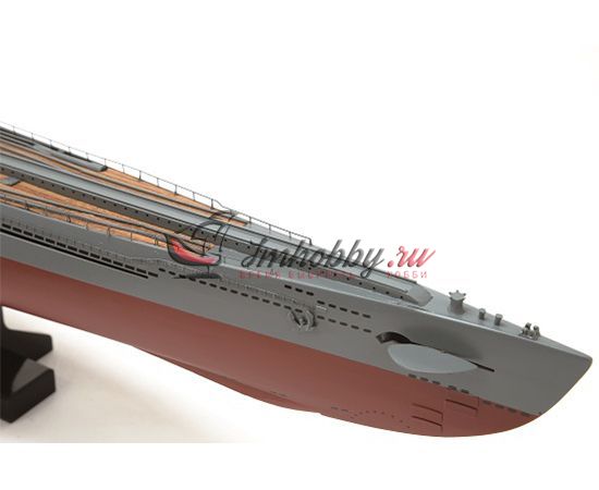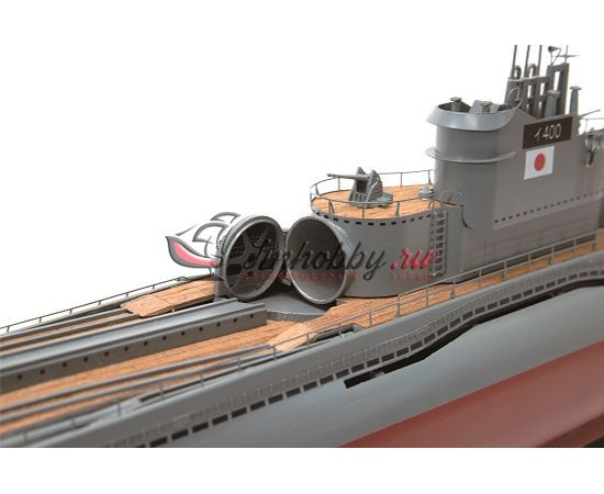I-400 была самой большой подводная лодкой, принятой на вооружение во время Второй Мировой Войны. И оставалась таковой вплоть до появления атомных подводных лодок. Длина I-400 составляла 122 метра. Эти размеры были необходимы для размещения трех самолетов-бомбардировщиков. Да, это была подводная лодка авианосец. Время погружения подлодки составляло всего около минуты.Спроектированы в 19421943 годах на роль подводных авианосцев сверхдальнего радиуса действия для операций в любой точке земного шара, в том числе у побережья США. Подводная лодка должна была иметь дальность плавания в 40 000 морских миль (74 000 км). Авиационная группа I-400 состояла из трёх гидросамолётов, бомбардировщиков-торпедоносцев Aichi M6A Seiran, с возможностью перевозить также четвёртый в частично разобранном виде. В походном состоянии самолёты хранились в ангаре, размещавшемся в рубке, при этом всё оперение самолётов складывалось так, чтобы не выходить за радиус пропеллера.I-400 была построена на верфи флота в Куре. Заложена 18 января 1943 г, спущена на воду в январе 1944 г. Введена в строй 30 декабря 1944 г. Сдалась американцам 27 августа 1945 г. Причем американцы до самого захвата не знали о существовании у японцев таких подводных лодок. После запроса советской стороны об этих субмаринах, американцы, боясь утечки информации в СССР, затопили все три доставшиеся им подводные лодки проекта I-400.Содержимое набора модели подводной лодкиЯпонская фирма Woody Joe предлагает вам сборную деревянную модель этой подводной лодки в масштабе 1:144. Корпус субмарины делается по традиционной наборной технологии из вырезанных лазером шпангоутов и киля. Палубы и продольные стрингеры обеспечивают жесткость почти 80 см корпуса. Обшивка корпуса выполняется из реек сосны, а на палубу идут рейки смолянистого тика 0,5х3 мм. Готовый корпус грунтуется, шпаклюется, снова грунтуется и окрашивается. Рубка с ангаром для самолетов имеет обшивку из фототравленных пластин сложной конфигурации, причем на пластинных предусмотрены ступеньки для стыковки друг с другом. Фототравлением же даны и леерные ограждения. Помимо деревянных деталей, вы найдете и металлические литые элементы. Это всевозможные люки и крышки, зенитная артиллерия, якоря, гребные винты. Завершают модель красивое основание, табличка и флаги. Кроме того, к этой подлодке отдельно можно купить и гидросамолет Aichi M6A Seiran.Сборочная инструкция в понятных пошаговых фотографиях, нумерация деталей простая, пояснения на японском языке, что заставит вас думать и смотреть на несколько шагов вперед. Спецификации:Масштаб: 1:144Длина 847 ммВысота 191 ммШирина 83 мм