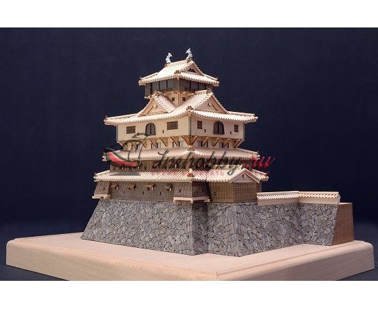 Замок Ивакуни был сооружен в 1608 году, в начале периода Эдо. Замок был построен на территории, имеющей естественные защитные преимущества. Замок защищала гора Сирояма, а половина его территории окружена естественным рвом, рекой Нисики. Сторожевая башня замка возвышается над городом на высоте 200 метров, сверху открываются потрясающие виды на мост и город. Замок был восстановлен в 1962 году. В главной башне замка экспонируется историческая коллекция самурайской брони и оружия.Все деревянные детали в наборе (от больших, в два пальца толщиной, до самых маленьких и тонких) уже вырезаны и аккуратно разложены по пакетикам. На каждом пакетике есть ярлык с номерами деталей, лежащих внутри, что облегчает поиск необходимой вам детали. В общем-то, можно сказать что производитель облегчил жизнь моделисту насколько это возможно - самое большее, что вам придётся сделать, кроме непосредственно сборки, это порезать рейки специальной фактуры на неровные кусочки для имитации каменной кладки. При постройке модели сначала полностью собирается каркас, а затем уже он обрастает деталями и декорациями. Табличка, детали для сборки подставки и материал для её украшения есть в комплекте. При желании, после постройки модель можно покрасить.Инструкция на японском языке, но она содержит такое большое количество фотографий, что сборка не должна вызвать проблем.Спецификации:Масштаб: 1:150Длина: 265 ммШирина: 215 ммВысота: 205 мм