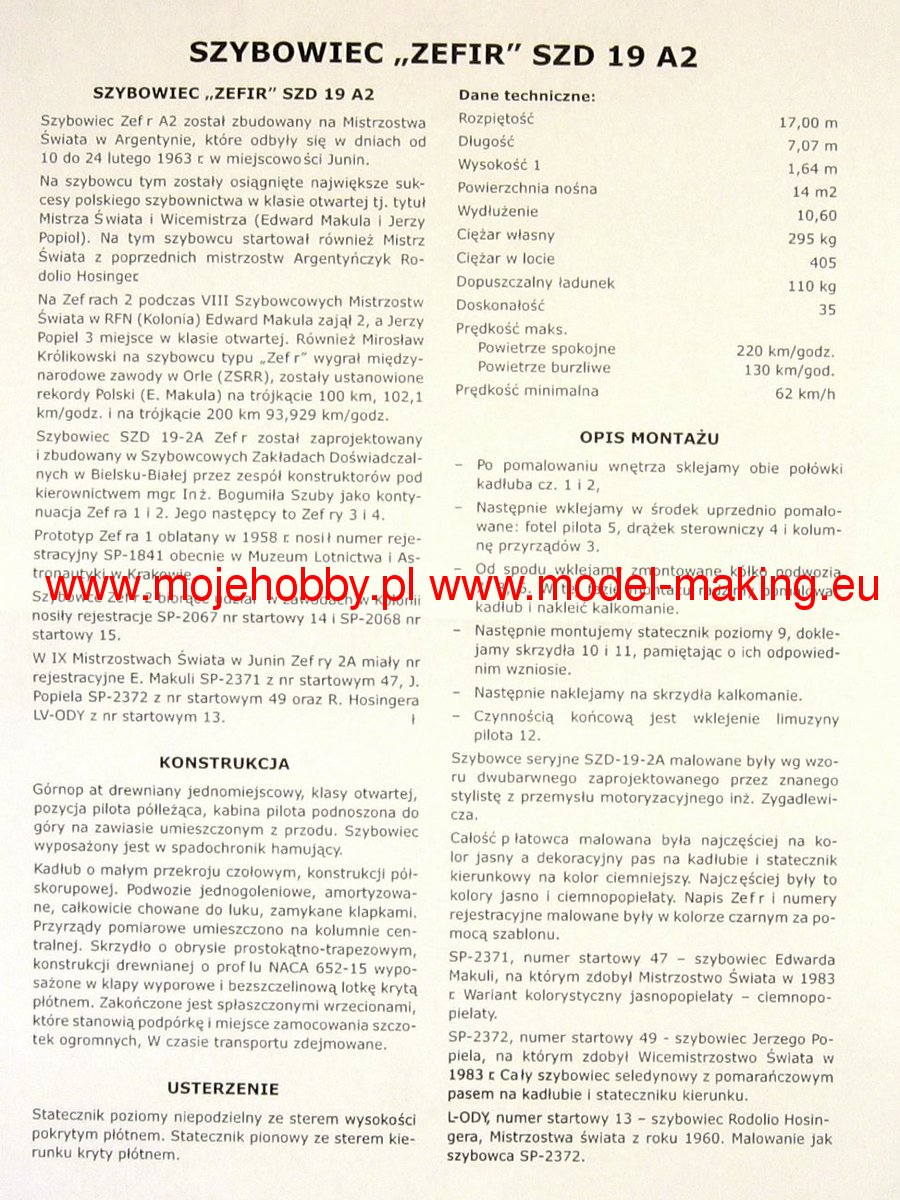 SZD-19-2 / 2A Zefir-2 / 2A was a Polish, single-seat, sports glider with a spine-wing structure and a wooden structure. The glider was developed at Szybowcowe Zakłady Doświadczalnych (SZD) based in Bielsko-Biała. The flight of the prototype took place in 1958, and serial production started in 1960. The curb weight of the glider was 295-330 kilograms. SZD-19 2A Zefir 2 was developed on the basis of the experience gained from the operation of the SZD-19x Zefir 1, as well as the conclusions of the 7th World Gliding Championships organized in 1958 in Leszno. Work on the new aircraft was supervised by MSc. Bogumił Szuba. Despite the Zefir 2 design being based on the Zefir 1 glider, a completely new glider was finally created, clearly exceeding its predecessor and equaling in almost every area the best designs in the world. Moreover, as early as 1962, an improved version of the Zefira-2, the Zefir-2A glider, was tested and put into production. It was on such a glider in 1963 in Argentina that Edward Makula and Jerzy Popiel won the titles of the Champion and Vice-Champion of the World in the open class, which is still one of the greatest achievements in the history of Polish sports gliding! It can be stated that in the 1960s the SZD-19-2 / 2A Zefir-2 / 2A glider was one of the best gliders in its class in the world.
