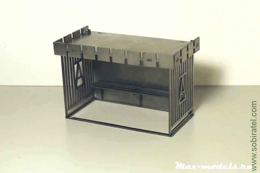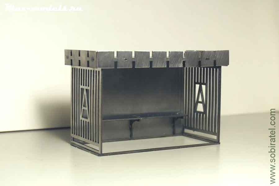 Технология производства - лазерная резка Материал - металл 1,2ммКол-во деталей - 11штМасса изделия - 100г.Толщина перемычек - 1,5мм Особенности комплекта: 1. Модель остановки собирается как конструктор, системой шип-паз, детали фиксируются клеем для прочности. (рекомендуем Loctite 401, Момент ГЕЛЬ) 2. На крыше модели предусмотрены проушины, для подъёма остановки краном.