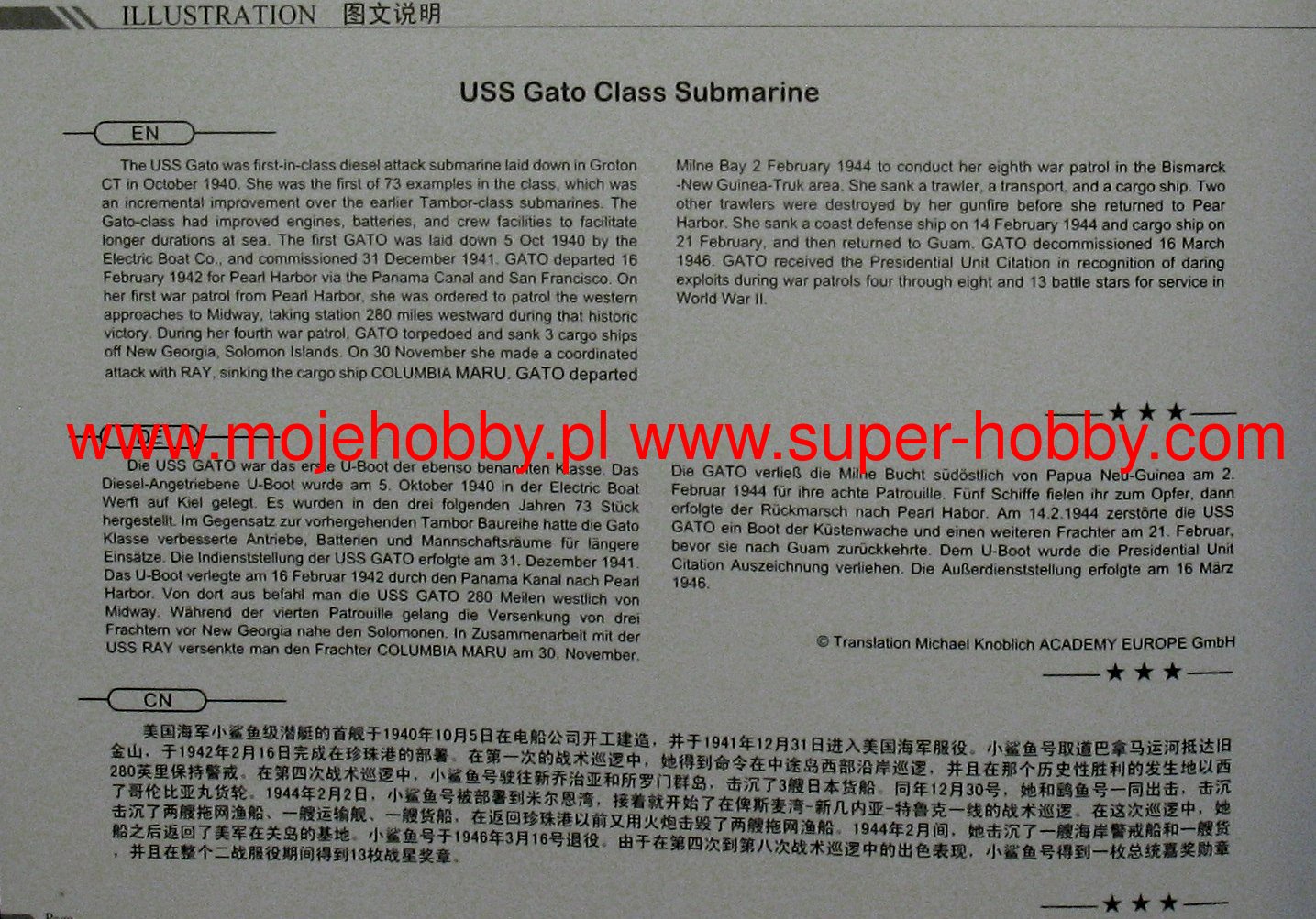 Gato is the name of a class of American diesel-electric fighter submarines (SS) of the Second World War. The first unit of this type was launched in 1940. In total, 77 units of this type were created. The Gato-class ship was 95 m long, 8.3 m wide, and had a displacement of about 2,400 tons. The maximum underwater speed is approx. 9 knots. The ships of this type had ten 533 mm torpedo tubes - including six bow and four stern. The ship's armament also included single 76 mm, 40 mm and 20 mm cannons. The Gato-class ships were developed and put into production as a far-reaching extension of the Tambor-class structure. Compared to their predecessors, they had a much longer swimming range and significantly improved combat capabilities. They also had new, highly reliable and proven diesel engines, which increased the possible patrol time of a single ship. Units of this type also offered - as for the submarines of that time - a good working comfort for the crew. They also had radio and electronic equipment as rich as those times. The Gato-class ships played a gigantic role in World War II, inflicting huge losses on the Japanese merchant navy in 1942-1945. It is worth adding that it was a ship of this class (USS Archerfish) that sank the Japanese carrier Shinano in November 1944. Some ships of this type, after modernization, remained in service with the US Navy until the end of the 1960s.