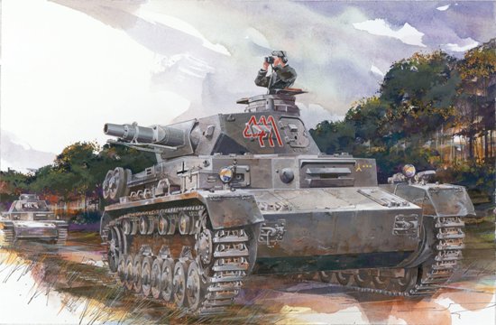 PzKpfw IV (Panzerkampfwagen IV) was a German medium tank from the Second World War. The first prototypes of the vehicle were created in 1936, and serial production continued in the period 1938-1945, ending with the production of about 8,600 vehicles. The D version of the tank was powered by a single Maybach HL 120 TRM engine with a capacity of 300 HP. It was armed with 1 75mm KwK 37 L / 24 gun and 2 7.92mm MG 34 machine guns. The PzKpfw IV was created as a result of a competition announced at the end of 1934 by the German Armaments Department for a medium tank weighing up to 18 tons and armed with a 75 mm gun. The competition was won by the Krupp company, whose vehicle was put into mass production - as it turned out, it was a vehicle that can be safely called the "workhorse" of German armored forces during World War II and one of the most intensively developed and modernized Wehrmacht tanks. Numerous variants of the PzKpfw IV were created in the course of production. Chronologically, the first was the A version, armed with a 75mm short-barreled gun and a 230hp engine. However, versions B and C appeared quickly, in which several significant changes were made: first of all, more powerful engines (265 HP in version B and Maybach HL 120 TRM with 300 HP in C version - which were installed in PzKpfw IV until 1945 year), and the armor of the entire car was improved. The F1 and F2 versions turned out to be a real revolution, in which the frontal armor was increased to 60 mm, and the main armament was changed to the great, long-barreled 75mm KwK 40 L / 43 cannon, which in 1942 and 1943 allowed them to fight any Allied or soviet. The most frequently produced versions of the PzKpfw IV were the G, H and J versions, which were very similar to the F1 and F2 versions. The main armament has not changed significantly (it was still the KwK 40 cannon), as well as the engine and chassis. On the other hand, the armor was slightly strengthened, and from the beginning of 1943 armored screens (Schurzen) were installed on them. Numerous other vehicles were built on the chassis of the PzKpfw IV, such as the StuG IV assault gun, the Nashorn tank destroyer or the Wirbelwind self-propelled anti-aircraft gun. PzKpfw IV tanks were used on almost all fronts of World War II - from the September campaign in 1939, through the campaign in France in 1940, the Barbarossa and Typhoon operations in 1941, the Battle of Kursk in 1943, to the last operations of the German army against The USSR and the Western Allies in 1944-1945.