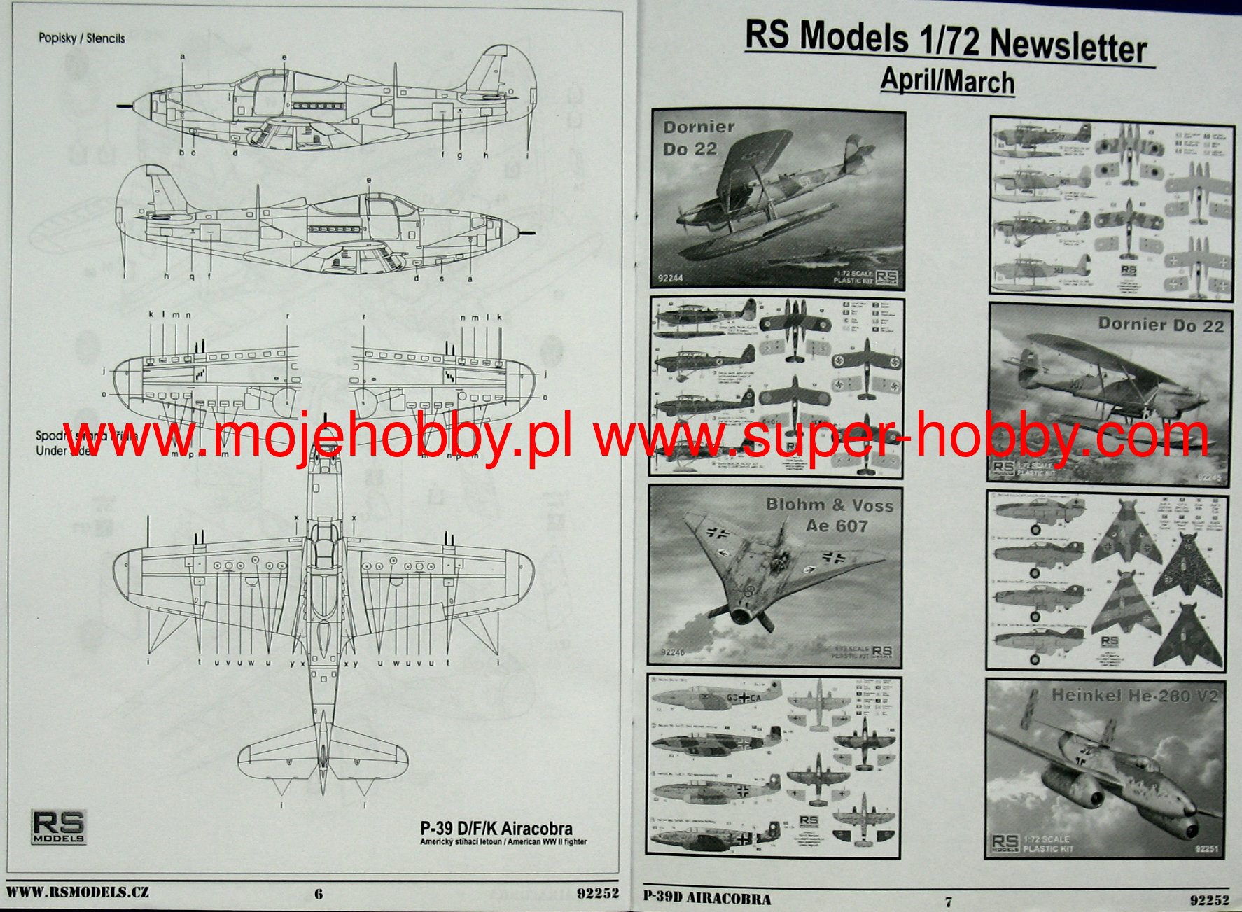 The Bell P-39 Airacobra is an American, single-engine, metal fighter plane with a classic tail in the low wing configuration with a three-wheeled undercarriage. The flight of the prototype took place on April 6, 1938, serial production was carried out in 1940-1944. Despite its conventional appearance, the Bell P-39 Airacobra was a unique design among US Army fighters during World War II, the first with a front wheel. This solution was dictated by the need to install heavy weapons in the nose part of the aircraft, which in turn corresponded to the expectations of the mid-1930s related to ensuring high firepower. In early 1935, the management of Bell Aircraft Corporation was present at the demonstration of the American Armament Corporation - T9 caliber 37 mm. Stunned by the results of the show, it led to the commencement of construction work on a fighter plane using a T9 cannon firing through the propeller hub and additionally equipped with two 12.7mm machine guns installed in the nose part of the fuselage and synchronized with the rotation of the propeller. The decision made to locate the cannon in the nose of the machine imposed the placement of the engine inside the fuselage. The propeller was driven by a long shaft located under the cabin floor. Such an installation of the engine, almost exactly in the center of gravity of the aircraft, entailed the need to use a three-wheeled undercarriage with a front wheel. The first major order for the 369 P-39 was placed in September 1940, and shipments began approximately seven months later. At the same time, the first export units ordered by the British began to leave the production line. They were to replace the worn-out Hawker Hurricane machines. Ultimately, however, the largest foreign recipient turned out to be the Soviet Union, which received about 4,700 aircraft, where the total number of assembled P-39s of all versions slightly exceeded 9,500. Technical data (P-39Q version): length: 9.2 m, wingspan: 10 , 4 m, height: 3.8 m, maximum speed: 605 km / h, speed of climb: 19 m / s, maximum range: 840 km, practical ceiling: 10700 m, armament: fixed - 4 7.62 mm M1919 machine guns, 2 machine guns M2 12.7mm caliber and 1 M4 37mm cannon, suspended - up to 230 kg of bombs.