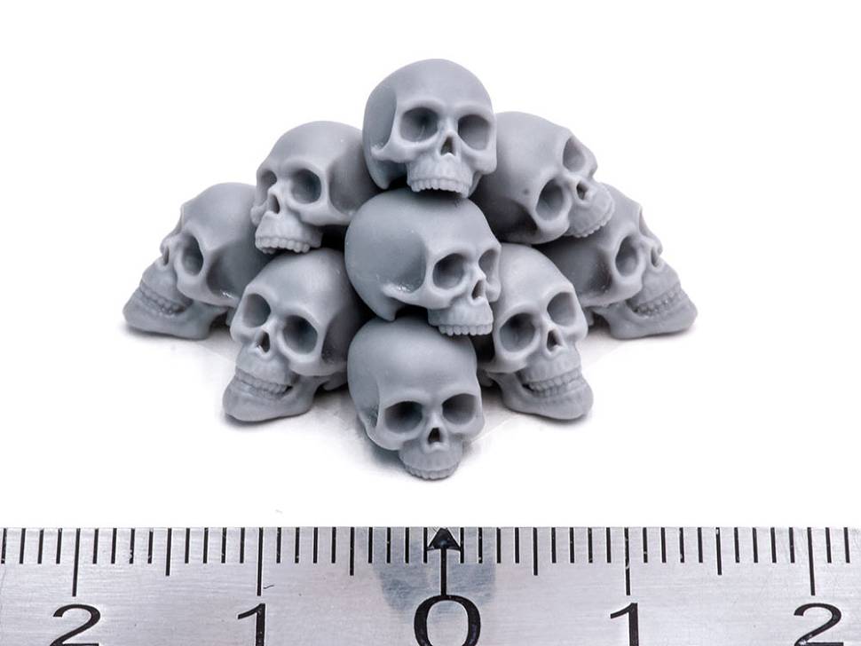 Набор из 10 полеуретановых человеческих черепов двух видов в масштабе предназначен для оформления баз миниатюр и диорам.