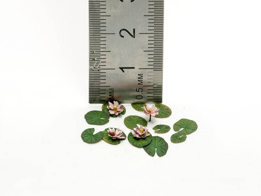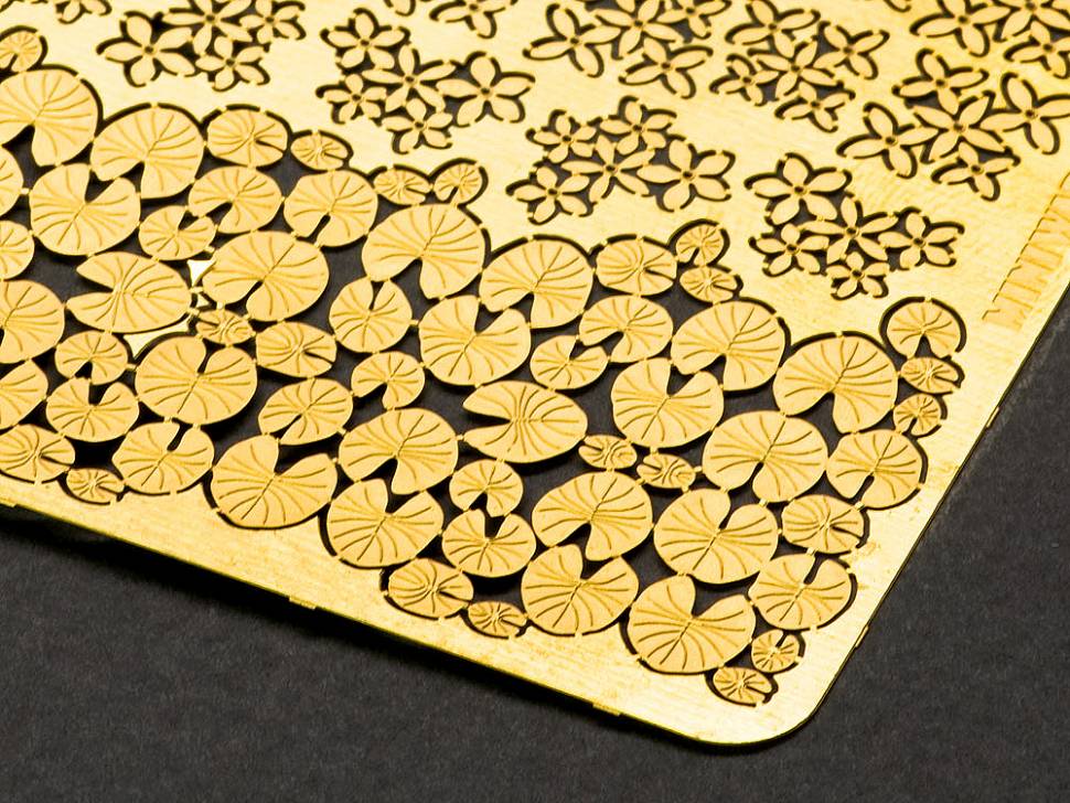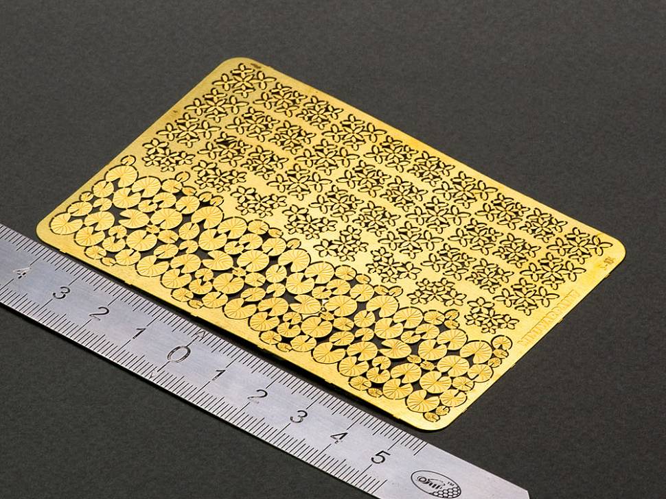 Кувшинка или Нимфея род водных растений, включающий в себя около 70 видов из них 7 встречается в России. Хорошо известное растение с крупными плавающими на воде сердцевидно-овальными или сердцевидно-округлыми листьями и крупными, как бы плавающими на воде цветками. Так же нередко их называют "водяная лилия". Распространены повсюду, кроме пустынь и высокогорий. На плате цветы и листья находятся в соотношении примерно 1 цветок к 2м листьям, и одной платы хватит на оформление нескольких водоемов. Для сборки цветов рекомендовано использование медной или латунной проволоки диаметром 0,4-0,5мм (в комплект не входит). Сборка относительно не сложная. Лепестки "дотсом" или аналогичным инструментом (тупым стеком, шариковой ручкой с толстым кончиком) на упругом коврике продавливаем, придавая форму лодочки. Лудим центральные колечки розеток лепестков и проволоку. На проволоке не должно быть больших плюх и потеков припоя, слой должен быть тоненьким, чтобы она без труда прошла в отверстие. На конце проволоки делаем маленькую петельку, она будет служить стопором. Розетки лепестков нанизываем на проволоку, на манер детской игрушки-пирамидки от самой маленькой и заканчивая самой большой розеткой. Розетки поворачиваем вокруг своей оси, чтобы лепестки следующего слоя оказывались между лепестками предыдущего, и пропиваем. Возможно, сборка на суперклей будет даже проще чем сборка на пайку.