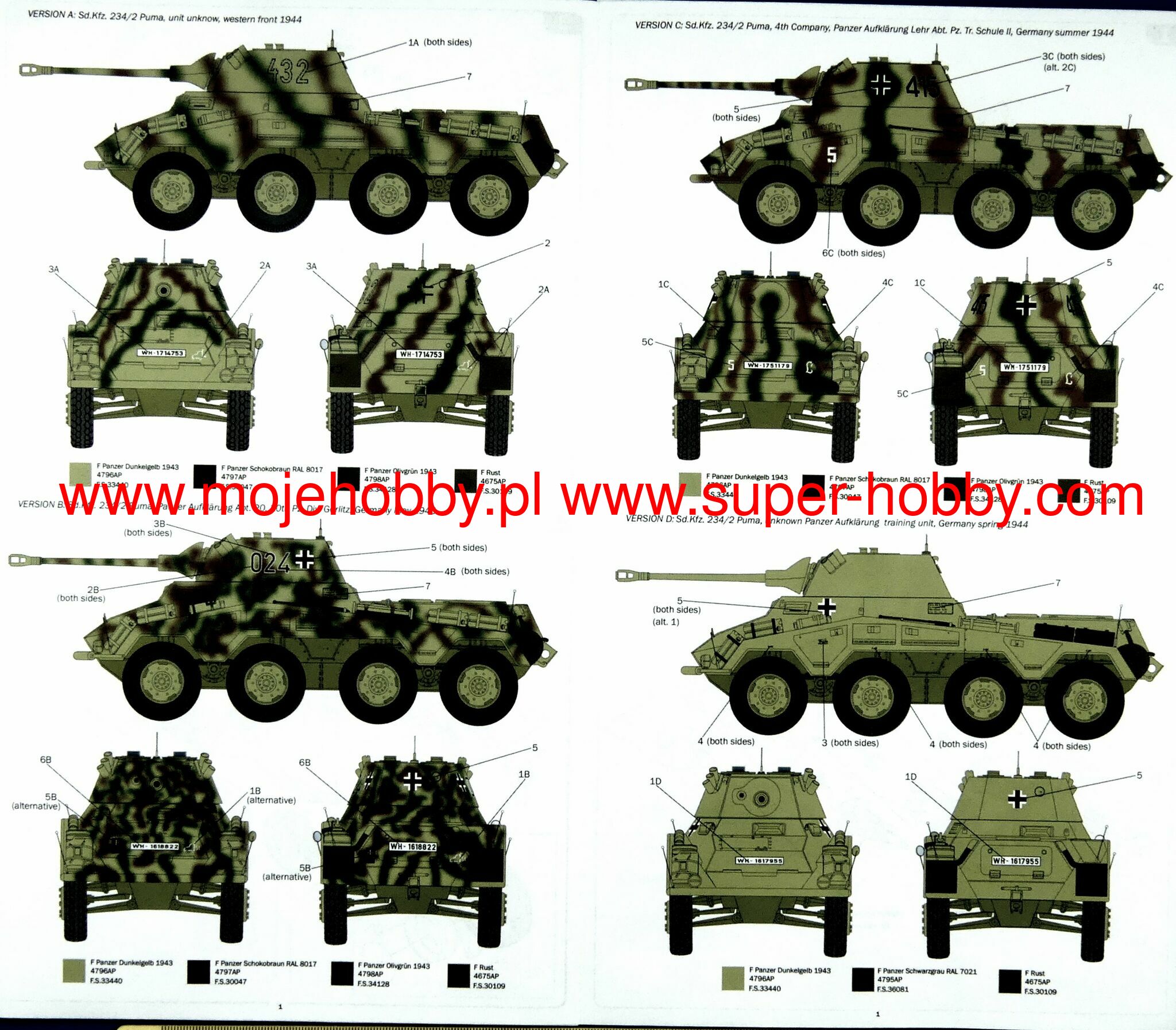 The German armored car ‘Schwerer Panzerspähwagen Sd.Kfz. 234/2’ known as "Puma", was developed and produced by the German war machine in the closing years of WW2. The vehicle proved to be an excellent mix of mobility, protection and firepower which was built upon the operational experience gained by the Wehrmacht in the early stages of the conflict. From 1939 onwards the German army had used armored vehicles very effectively for advanced reconnaissance tasks, and also in a ground support role for its troops. The “Puma” was initially a reconnaissance vehicle, but due to its KwK 39 L / 60 50 mm gun it could also be used equally effectively in offensive actions against infantry and other armored vehicles. It was deployed in limited numbers on both the Eastern and Western fronts. The highly effective independent suspension system of the eight wheels and the powerful engine, enabled the Puma to reach speeds of up to 90 km/h on all types of battlefield terrain.