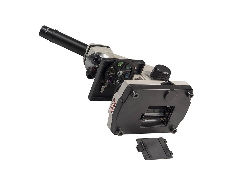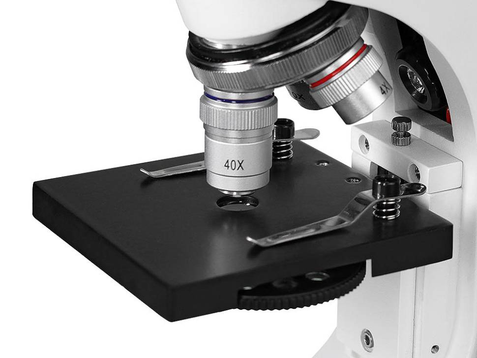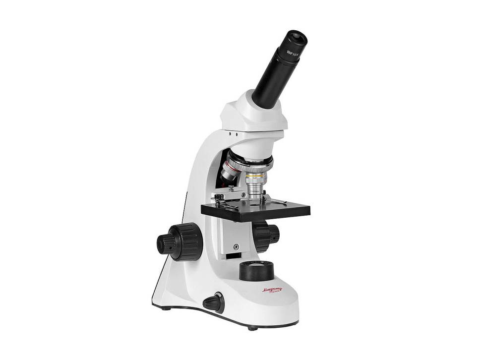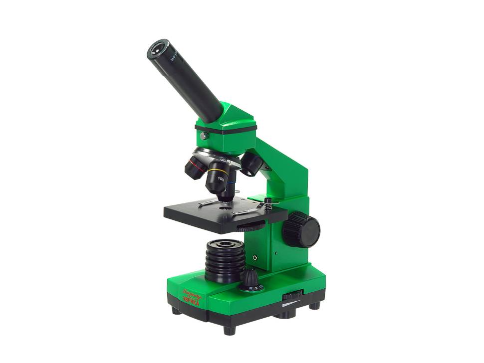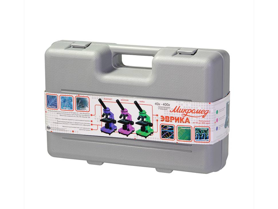 Микроскоп предназначен для наблюдения объектов в проходящем и отраженном свете в светлом поле. Микроскоп может быть использован при учебных и лабораторных работах в области биологии в домашних условиях, а так же в школах, лицеях и дошкольных учебных заведениях. Микроскоп оснащен встроенными осветителями, которые работают от сети переменного тока 220В через адаптер (не входит в комплект) и от трех батареек типа АА (не входят в комплект). Универсальность питания осветительной системы позволяет использовать микроскоп и в домашних условиях, и в учебных классах, и в походных условиях. Микроскоп предназначен для изучения биологических объектов в виде мазков и срезов. При работе с объективами 4х и 10х можно изучать непрозрачные плоские объекты. Для выведения изображения на экран ПК, просмотра и работы с файлами можно использовать камеру (видеокуляр). В стандартную комплектацию микроскопа не входит. Характеристики Увеличение микроскопа, крат - 40 - 400 Угол наклона визуальной насадки, град - 45 Увеличение насадки - 1 Окуляры - 10х, посадочный диаметр 23,2 мм Револьверное устройство - на 3 объектива Объективы - 4x/0,1; 10x/0,25; 40x/0,65 Предметный столик, мм - 90х90 Конденсорное устройство - диск с набором из 6 диафрагм со встроенными светофильтрами Источник проходящего света - точечный светодиод Источник отраженного света - точечный светодиод Источник питания, В - батарейки 3 шт. типа AA, 4.5B - не входят в комплект Источник питания - сеть переменного тока, В/Гц - 220 +-22/50 через адаптер - не входит в комплект Габаритные размеры, мм - в кейсе - 390х255х135 Комплектность Штатив микроскопа с наклонным окулярным тубусом, встроенным осветителем отраженного света с регулировкой яркости (светодиод) и трехгнездным револьвером - 1 Основание со встроенным осветителем проходящего света с регулировкой яркости (светодиод) и встроенным блоком питания- 1 Столик прямоугольный (90х90мм) (с клеммами и диском с диафрагмами со светофильтрами) - 1 Объектив - 4х0,1 - 1 Объектив - 10х0,25 - 1 Объектив - 40х0,65 - 1 Окуляр 10х - 1 Пластмассовая коробка с 5 предметными и 10 покровными стеклами и 5 подготовленными образцами - 1 Шнур сетевой - 1 - не входит в комплект, поставляется по доп. заказу Микротом - 1 Инкубатор для артемий - 1 4 флакона: дрожжи, смола "Резиновый наполнитель", морская соль, икра артемий Пинцет - 1 Пипетка - 1 Отвертка - 1 Кейс для переноски - 1 Руководство по эксплуатации - 1 Чехол - 1 Достоинства Бюджетный вариант комплектации: только самое необходимое для начинающего исследователя. При этом сохраняются все достоинства самого микроскопа. Эта модель - прекрасный подарок: микроскоп поставляется в кейсе, удобном для переноски; в комплекте с микроскопом - маленькая микролаборатория для самостоятельного изготовления препаратов; яркий дизайн. Оптические элементы из стекла и металлическая конструкция обеспечивают хорошее качество изображения и длительный срок эксплуатации микроскопа. Встроенные осветители - светодиоды - позволяют быстро настроить освещение. Осветители имеет регулировку яркости, что позволяет настроить освещение комфортно: при работе с объективами большого увеличения требуется более высокая яркость для получения хорошего качества изображения, а при работе с объективом малого увеличения требуется уменьшить освещенность объекта. Осветитель отраженного света позволяет исследовать на малом у
