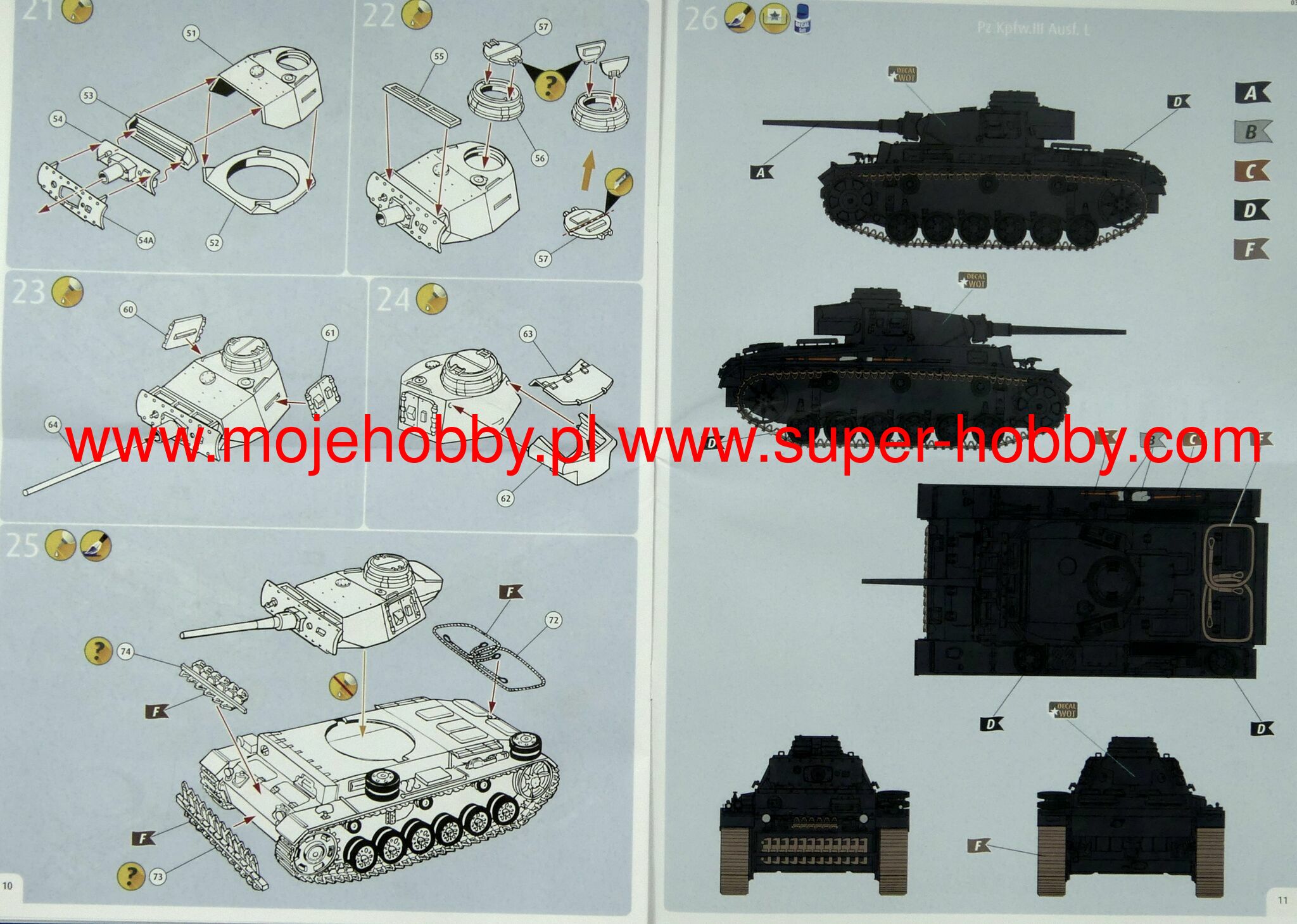 The PzKpfw III (Panzerkampfwagen III) was a German medium tank from the Second World War. The first prototypes of the vehicle were made in 1936, and serial production continued in the period 1937-1943, ending with the production of about 5,800 vehicles. The tank in the E version was powered by a single Maybach HL 120 TRM engine with a capacity of 300 HP. It was armed with one 37mm KwK 35/36 cannon and two 7.92mm MG 34 machine guns. placed in the tower. PzKpfw III was the "workhorse" of the German armored forces during World War II and one of the most intensively developed and modernized Wehrmacht tanks. Its serial production started in 1936, and many variants of this tank were created in its course. Chronologically, the first version was the A version, armed with a 37mm gun and a 230hp engine. However, already in December 1938, the E version was created, which was the first version produced in large series. It had a new, significantly more powerful engine, a completely new suspension and stronger armor in the front part of the turret and hull. Later (from December 1940) it was also armed with a more powerful 50mm cannon. In March 1940, the G version began to be produced, in which the rear hull and turret armor was reinforced. Soon after, in October 1940, the production of the H version started, which from the very beginning was armed with the 50mm KwK 38 L / 42 gun and had reinforced frontal armor. One of the most produced was the J version, which had armor up to 50 mm thick (later reinforced with aplique plates), and after the experience gained from the clashes with the T-34 and KW-1 vehicles - it was intensively rearmed for the KwK 39 L / 60 cannon. cal. 50 mm. The last development version was the N version, which was to be a support tank for armored grenadiers and was armed with a 75mm KwK 37 L / 24 short-barreled cannon. Numerous other vehicles were built on the chassis of the PzKpfw III, such as the StuG III assault gun. PzKpfw III tanks were used on almost all fronts of World War II - from the September campaign in 1939, through the campaign in France in 1940, operations Barbarossa and Typhoon in 1941, the Battle of Kursk in 1943, to the last operations of the German army against The USSR and the Western Allies in 1944-1945.