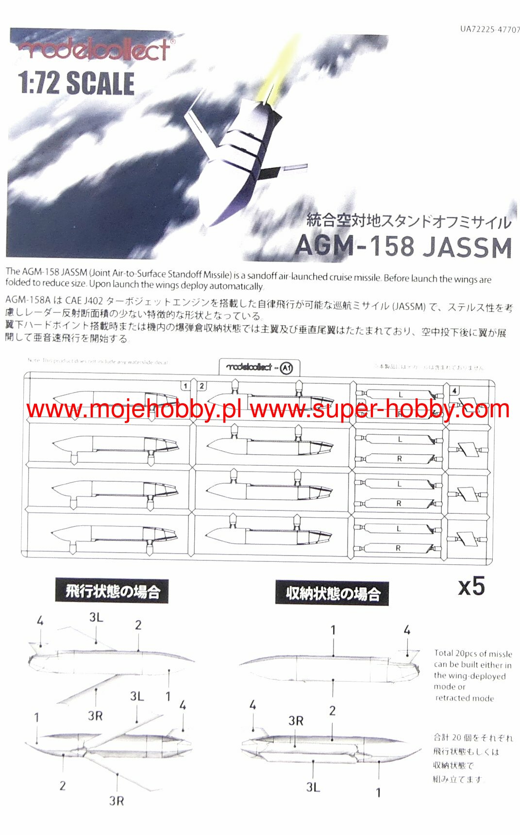 AGM-158 JASSM (ang. Joint Air-to-Surface Standoff Missile ) is a modern, American, air-to-ground maneuvering missile with reduced detectability. The weapon entered service and remains fully operational in 2009. The missile is 4.27 meters long, and its warhead can weigh up to 450 kilograms. The drive is provided by a single jet engine Teledyne CAE J402-CA-100. However, the officially reported range of the missile is approx. 370 kilometers. Design work on the AGM-158 began in the mid-1990s, and in 1998 the US Air Force decided to entrust the implementation of the project to Lockheed-Martin. From the very beginning, it was assumed that the new missile would have a large range and would be fired by planes operating beyond the range of enemy air defense. Moreover, efforts were made to reduce the missile's radar signature and the possibility of its detection by other means of detection as much as possible. These assumptions were fulfilled to a large extent, and after several years of attempts and removal of technical shortcomings, the AGM-158 is undoubtedly an effective weapon of tactical and operational importance. In the US air force and in the US Navy aviation, it is carried by machines such as: F-15E Strike Eagle, F / A-18 E / F Super Hornet or F-35 Lightning II. Moreover, the missile is used by the air forces of several countries, including Poland. In the Polish Air Force, the missile is carried by the F-16 C / D Jastrząb machines.