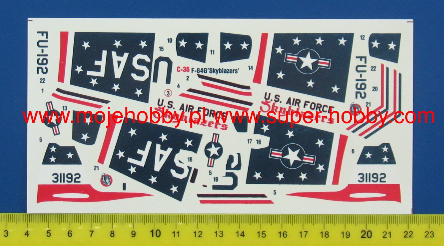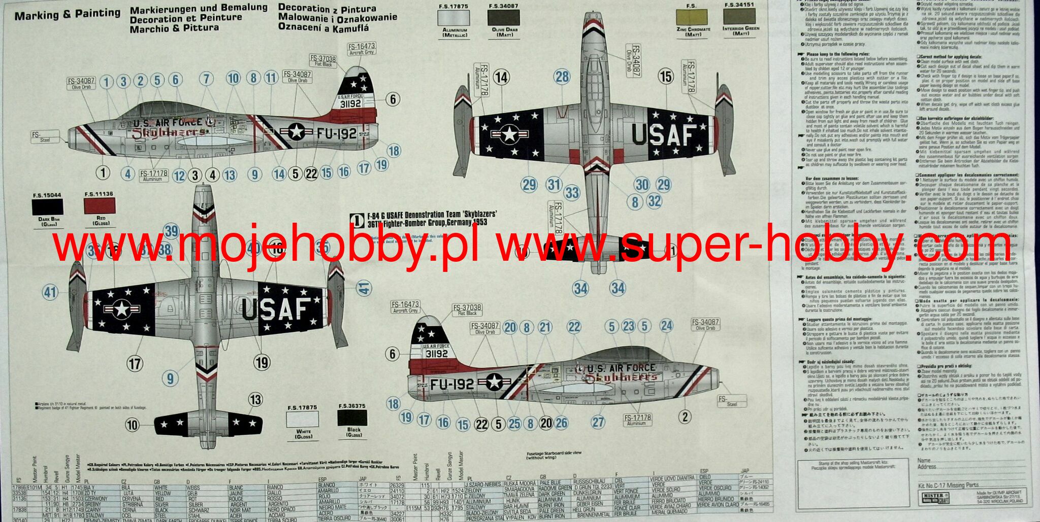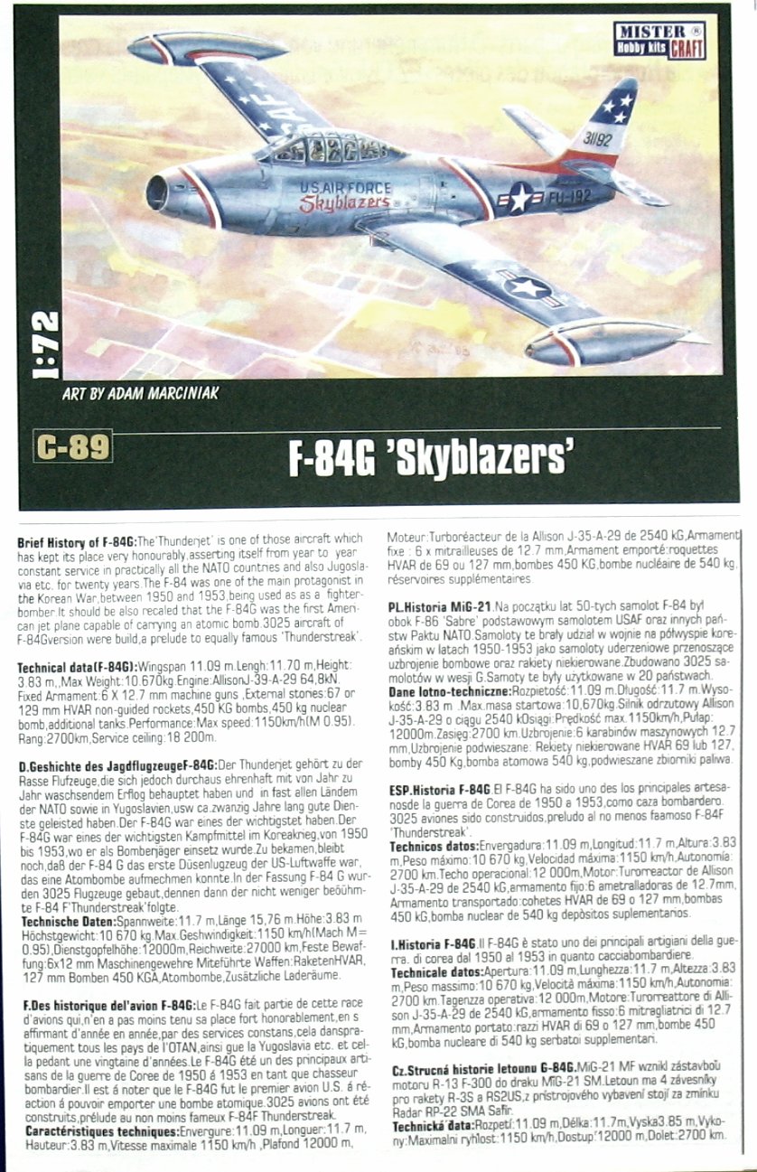 The Republic F-84 Thunderjet is an American single-seat, single-engine fighter-bomber. It was one of the first jet-powered fighters in the service of the US Air Force. The flight of the prototype took place in February 1946, and by 1953, 4,450 examples of this aircraft were built. Originally it was supposed to be called P-84, but it was eventually changed to F-84. The F-84E variant had a 12-inch longer fuselage in the pilot's cockpit to make flying more comfortable. The capacity of the fuel tank has also increased. The under-wing knots were also redesigned so that it was possible to carry additional fuel tanks instead of bombs. Far-reaching changes affected the F-84F Thunderstreak version, which received oblique wings, a new engine and served primarily as an attack aircraft. The "G" model has also undergone more in-depth changes. First of all, it received a new Allison J35-A-29 engine with a thrust of about 2650 kg, which increased its top speed to 1000 km / h and a range of 1600 km. The F-84G was also the first fighter capable of carrying nuclear weapons. F-84 aircraft were used on a large scale during the Korean War. In the first period of the conflict, they performed fighter functions, but as a result of the disastrous balance of air fights with the Mig 15s (8 victories against 64 lost planes), they quickly switched to the role of reconnaissance and attack aircraft. Technical data (F-84G version): Maximum speed: 1000 km / h, speed of climb: 19.1 m / s, maximum ceiling 12 350 m, maximum range: 1600 km, armament: fixed - 6 M2 Browning 12 machine guns, 7mm, sling - up to 2020kg of bombs and rockets, including the Mark VII nuclear bomb.