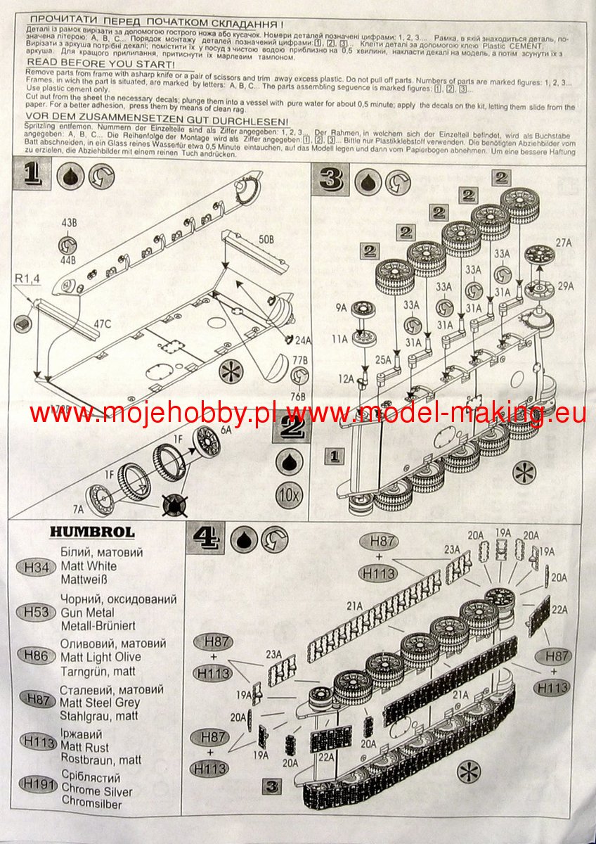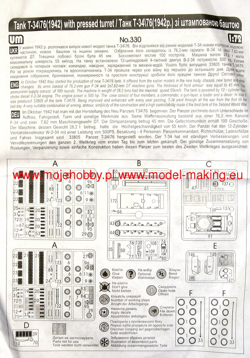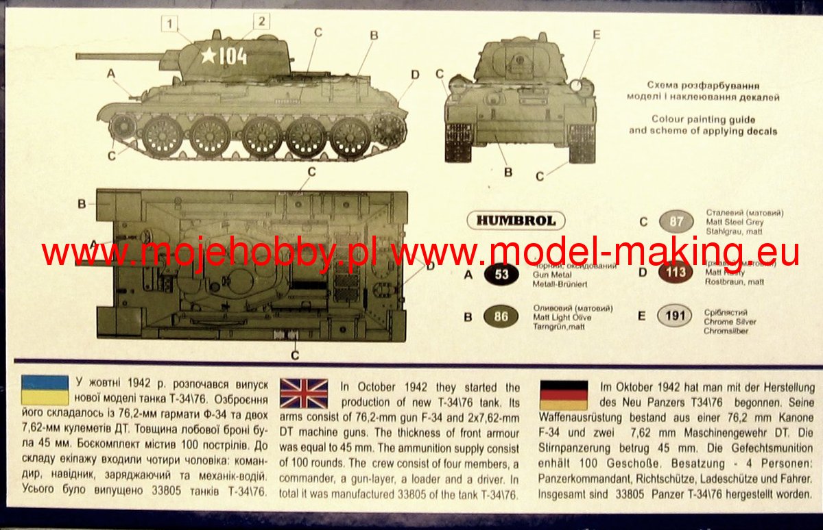 The T-34 was a Soviet medium tank from the Second World War and the post-war period. The first prototypes were built in 1937-1940, and serial production in the USSR was carried out in 1940-1957. About 84,000 vehicles of this type were built in its course, which makes the T-34 one of the most produced tanks in history! The drive was provided by a single engine V-2-34 with a power of 500 hp. The length of the car - in the T34 / 76 version - was 6.68 m, with a width of 3 meters. The armament consisted of a 76.2 mm F-34 gun and two 7.62 mm DT machineguns. The main armament in the T-34/85 version was the 85mm ZIS-S-53 gun. The T-34 is undoubtedly one of the most famous tanks in the history of both World War II and military in general, representing a specific symbol of Soviet victory in the war with the Third Reich. The vehicle was developed for the needs of the Red Army as a successor to the so-called pursuit tanks from the BT series (BT-5 and BT-7), but also the T-26 tank. Work on the car started in 1937 in a special design office at the Steam Engine Factory in Kharkiv. Initially, the works were managed by Eng. Adolf Dik (he also made the first sketches of the new car), and after his arrest by the Soviet security authorities, Mikhail Koszkin managed the work. Initially, the vehicle was designated as A-20. However, a second prototype (A-32) was quickly built, with a main armament in the form of a 76.2 mm cannon and much thicker frontal armor. It was the latter prototype that was finally adopted for production. It can be assumed that when it was introduced into service, the TT-34 was a very successful tank in many respects. It was characterized - as in 1940 - with a very strong weapon, it had a well-profiled armor based on sloped armor plates, as well as very high mobility and off-road driving properties. The disadvantages include the very poor ergonomics of the car or the poor optics used in the first production batches. Despite these shortcomings, when the T-34 appeared on the Eastern Front, German troops were greatly surprised by it. The high overall rating of the T-34 and its combat values determined its mass production and making it the basic tank of the Red Army during the fights in 1942-1945. They also resulted in further improvements to the structure, e.g. in 1942 a new hexagonal tower appeared, improving the quality of work of crew members with the commander's cupola. The engine and gearbox were also improved. However, in 1944, the T-34/85 model was introduced into service, with a completely new three-man turret and the main armament in the form of an 85 mm cannon. The T-34 tank fought in virtually all major battles fought between the Red Army and the Wehrmacht on the Eastern Front in 1941-1945: starting at the Battle of Moscow, through the battles of Stalingrad and Kursk, Operation Bagration, and the capture of Berlin. After 1945, the T-34 tank was still in service, it was also widely exported outside the USSR to countries such as Czechoslovakia, Poland, East Germany, Hungary and Syria.