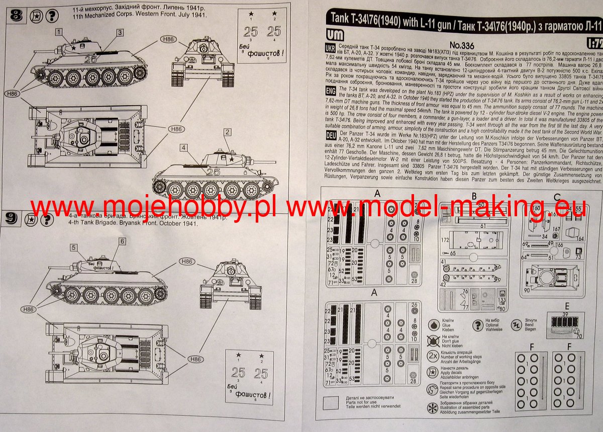 The T-34 was a Soviet medium tank from the Second World War and the post-war period. The first prototypes were built in 1937-1940, and serial production in the USSR was carried out in 1940-1957. About 84,000 vehicles of this type were built in its course, which makes the T-34 one of the most produced tanks in history! The drive was provided by a single engine V-2-34 with a power of 500 hp. The length of the car - in the T34 / 76 version - was 6.68 m, with a width of 3 meters. The armament consisted of a 76.2 mm F-34 gun and two 7.62 mm DT machineguns. The main armament in the T-34/85 version was the 85mm ZIS-S-53 gun. The T-34 is undoubtedly one of the most famous tanks in the history of both World War II and military in general, representing a specific symbol of Soviet victory in the war with the Third Reich. The vehicle was developed for the needs of the Red Army as a successor to the so-called pursuit tanks from the BT series (BT-5 and BT-7), but also the T-26 tank. Work on the car started in 1937 in a special design office at the Steam Engine Factory in Kharkiv. Initially, the works were managed by Eng. Adolf Dik (he also made the first sketches of the new car), and after his arrest by the Soviet security authorities, Mikhail Koszkin managed the work. Initially, the vehicle was designated as A-20. However, a second prototype (A-32) was quickly built, with a main armament in the form of a 76.2 mm cannon and much thicker frontal armor. It was the latter prototype that was finally adopted for production. It can be assumed that when it was introduced into service, the TT-34 was a very successful tank in many respects. It was characterized - as in 1940 - with a very strong weapon, it had a well-profiled armor based on sloped armor plates, as well as very high mobility and off-road driving properties. The disadvantages include the very poor ergonomics of the car or the poor optics used in the first production batches. Despite these shortcomings, when the T-34 appeared on the Eastern Front, German troops were greatly surprised by it. The high overall rating of the T-34 and its combat values determined its mass production and making it the basic tank of the Red Army during the fights in 1942-1945. They also resulted in further improvements to the structure, e.g. in 1942 a new hexagonal tower appeared, improving the quality of work of crew members with the commander's cupola. The engine and gearbox were also improved. However, in 1944, the T-34/85 model was introduced into service, with a completely new three-man turret and the main armament in the form of an 85 mm cannon. The T-34 tank fought in virtually all major battles fought between the Red Army and the Wehrmacht on the Eastern Front in 1941-1945: starting at the Battle of Moscow, through the battles of Stalingrad and Kursk, Operation Bagration, and the capture of Berlin. After 1945, the T-34 tank was still in service, it was also widely exported outside the USSR to countries such as Czechoslovakia, Poland, East Germany, Hungary and Syria.
