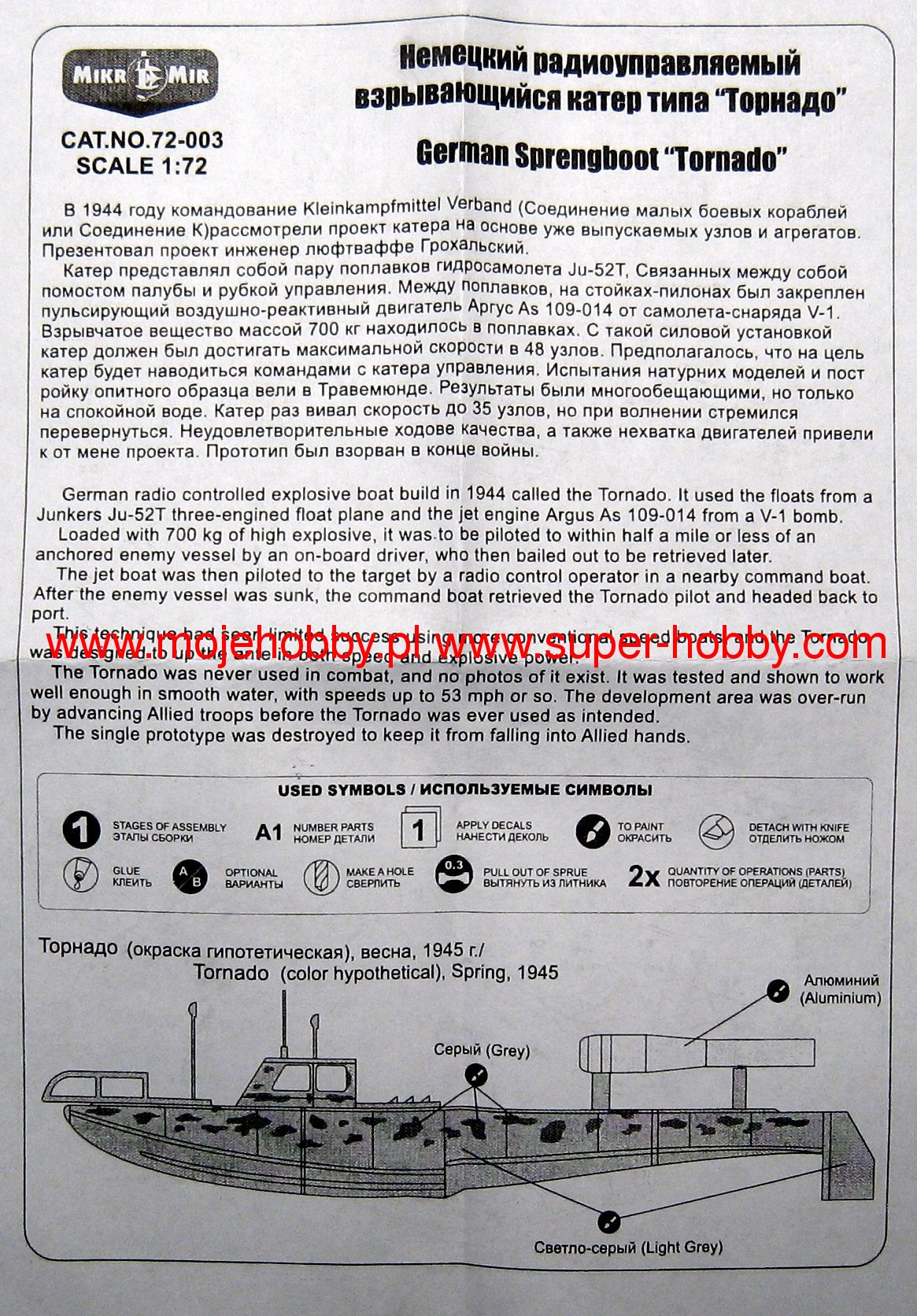 Sprengboot Tornado прототип, дистанционно управляемая немецкая лодка с зарядом взрывчатого вещества времен Второй мировой войны. В качестве движителя агрегат использовал традиционный, единый авиадвигатель, перенесенный с самолета Юнкерс Ю-52, и ракетный двигатель - такой же, как в ракетах Фау-1. Установка могла нести до 700 кг заряда взрывчатого вещества. Планировалось, что катер на ранней стадии атаки будет управляться рулевым, а на последней фазе по радио с катера или сопровождающего его катера. После удачной атаки рулевого предполагалось выловить из моря, но есть много указаний на то, что в случае применения Sprengboot Tornado на практике это было бы почти самоубийственным оружием. Лодка так и не вышла за пределы стадии прототипа, и нет никаких источников, подтверждающих участие Торнадо в боевых действиях. Единственный построенный был уничтожен в 1945 году, чтобы не попасть в руки западных союзников.