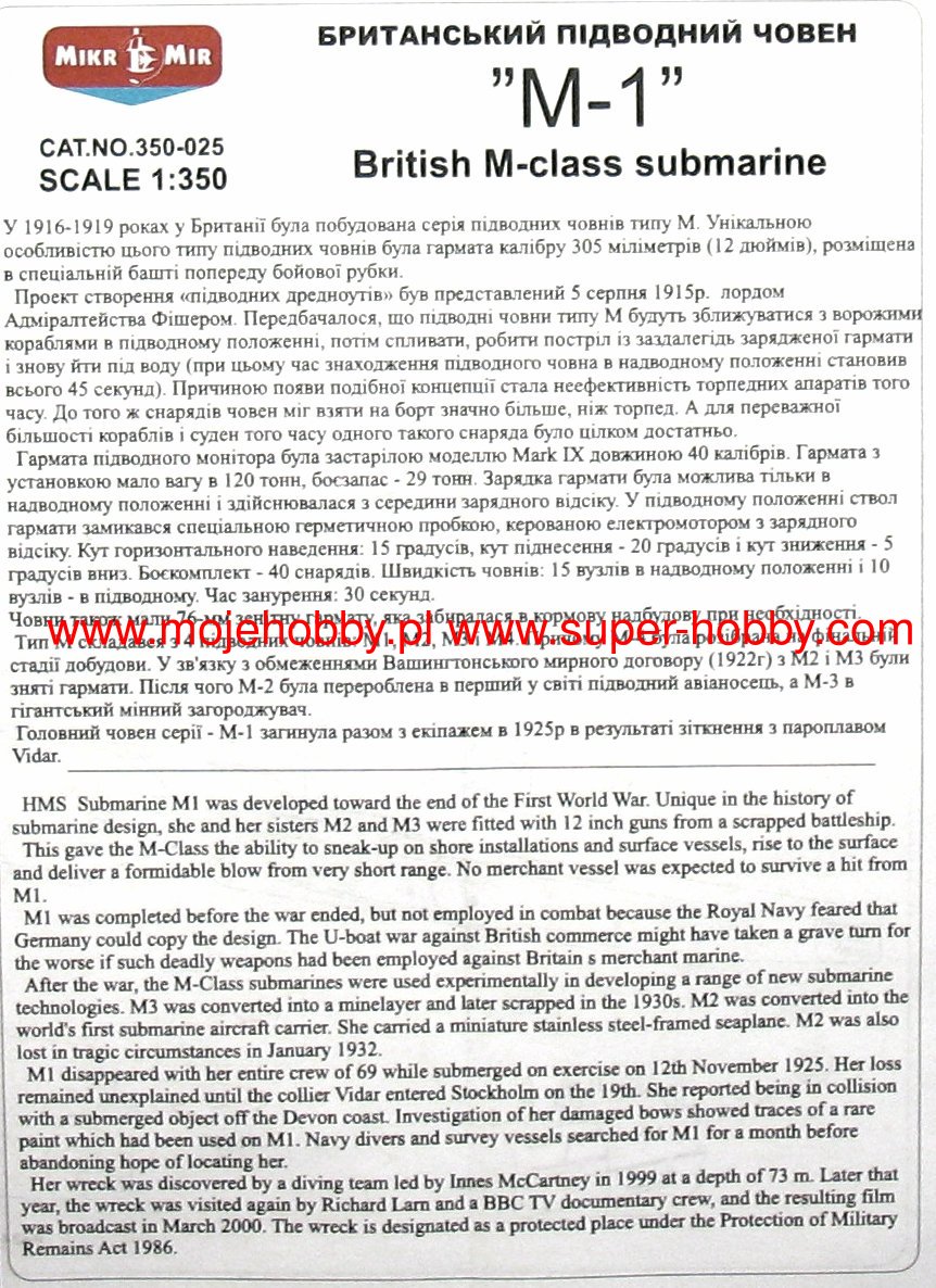 Type M is the name of a class of British diesel-electric submarines from the First World War and the post-war period. The first unit of this type was launched in 1917, and the last - two years later. In total, only three units of this type were built. The Type M ship was 90-92 m long, 7.55 m wide, and had a displacement of about 1,950 tons. The maximum underwater speed is around 8-9 knots. The ships of this type had a single 305 mm gun, a single 75 mm gun, one 7.62 mm machine gun, and four 450 mm torpedo tubes. The Type M ships were submarines with the most powerful artillery armaments ever commissioned. They were developed and put into production on the initiative of the first Lord of the British Admiralty, John Fisher, when he held this office for the second time in 1914-1915. It was assumed that ships of this type would approach enemy ships underwater and then, after surfacing, would start exchanging fire with them by surprise. However, these assumptions turned out to be problematic, and ships of this type did not take an active part in World War I. After 1918, new types of weapons were tested on them, such as mines or new types of seaplanes. Vessels of this type also turned out to be very unlucky, as two of the three sank in tragic accidents in 1925 and 1932. The last ship in the series, HMS M3, was decommissioned in 1932 and scrapped a year later.