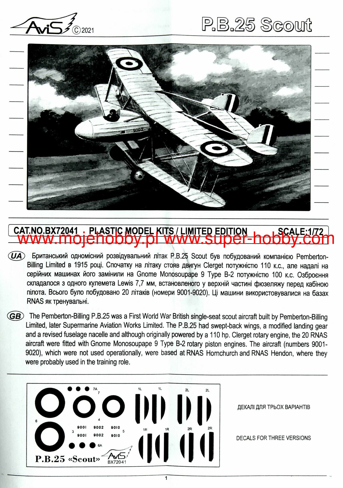 Pemberton-Billing PB25 was a British reconnaissance and training aircraft from the First World War, which was flown in 1915, and about 20 machines of this type were built in the course of mass production. The plane was 7.34 meters long with a wingspan of 10.06 meters. The drive was provided by a single 100 HP Gnome Monosoupape 9 engine. The maximum speed was 159 km / h, with the maximum range of approximately 320 kilometers. The deck armament consisted of a single 7.7mm Lewis machine gun. The PB25 aircraft was developed at the Pemberton-Billing Limited aviation plant, which later became Supermarine Aviation Works Limited. The presented machine was based on the earlier PB23 model, and the main changes concerned the wing structure, fuselage nacelle, chassis and engine - a new, more powerful power unit was used. However, the plane still used a push propeller, an unusual tail tail system and, in essence, a suspended fuselage nacelle. The only recipient of this machine was the Royal Navy Air Service (RNAS), which used it for training purposes. The machine has never been used in combat.