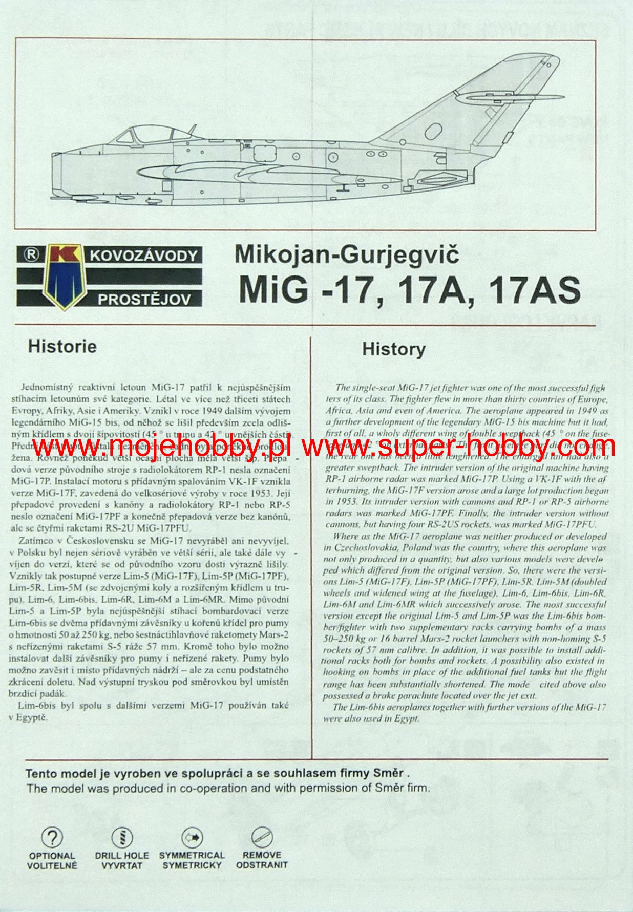 The Mikojan-Guriewicz MIG-17 is a Soviet, single-engine, medium-wing metal jet fighter with slanted wings and a classic tail, known in the NATO code as Fresco. The prototype flight took place in January 1950. The MIG-17 was an extension of the MIG-15 design. The changes focused on a new engine (Klimov WK-1F), better aerodynamics and the use of radar on one of the development versions. Several basic versions of this aircraft were created. The first mass-produced version is the MiG-17F. Another one, equipped with a radar, was the MiG-17PF, and the MiG-17PFU version had the option of guiding the missiles using the on-board radar. The plane was also produced under the license of min. in Poland and China. In Poland, serial production started in 1956 under the designation Lim-5, and an assault version (Lim-6bis) was also created. The MIG-17 aircraft is still used by the Mali and North Korean aviation. Technical data (MIG-17F version): length: 11.26m, wingspan: 9.63m, height: 3.8m, maximum speed: 1145km / h, rate of climb: 65m / s, maximum range: 2060km, maximum ceiling 16600m armament: fixed - 2 Nudelman-Rikhter NR-23 cannons, caliber 23 m and 1 Nudelman N-37 cannon, caliber 37 mm, suspended - up to 500 kg of bombs and rockets.