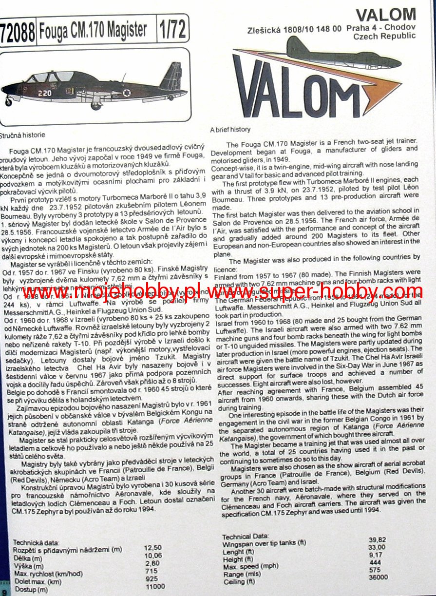 Fouga CM.170 Magister is a French, twin-engine, training plane designed by the Fouga et Cie. It was the first French jet plane. The flight of the prototype took place on July 23, 1952, and they were delivered to the linear units in 1954. The machine was distinguished by an unusual butterfly tail, but also great flight parameters and high overall quality of the structure. It was powered by two Turboméc Marboré IIA engines. There was also a special version for the French Navy (CM.175 Zephyr), which was flown in 1959. The aircraft was built under license in Germany, Finland and Israel. In the last of these countries, they were armed with small arms, bombs and unguided air-to-ground missiles, making the CM.170 light attack aircraft. Such redesigned participants of in the Six-Day War in 1967. Due to its very good properties, the plane served in the French army until the 1980s. Technical data: Maximum speed: 715 km / h, speed of climb: 17 m / s, maximum ceiling 11,000 m, maximum range: 925 km, armament: fixed - 2 machine guns, caliber 7.5 mm, suspended - up to 140 kg of bombs or missiles.