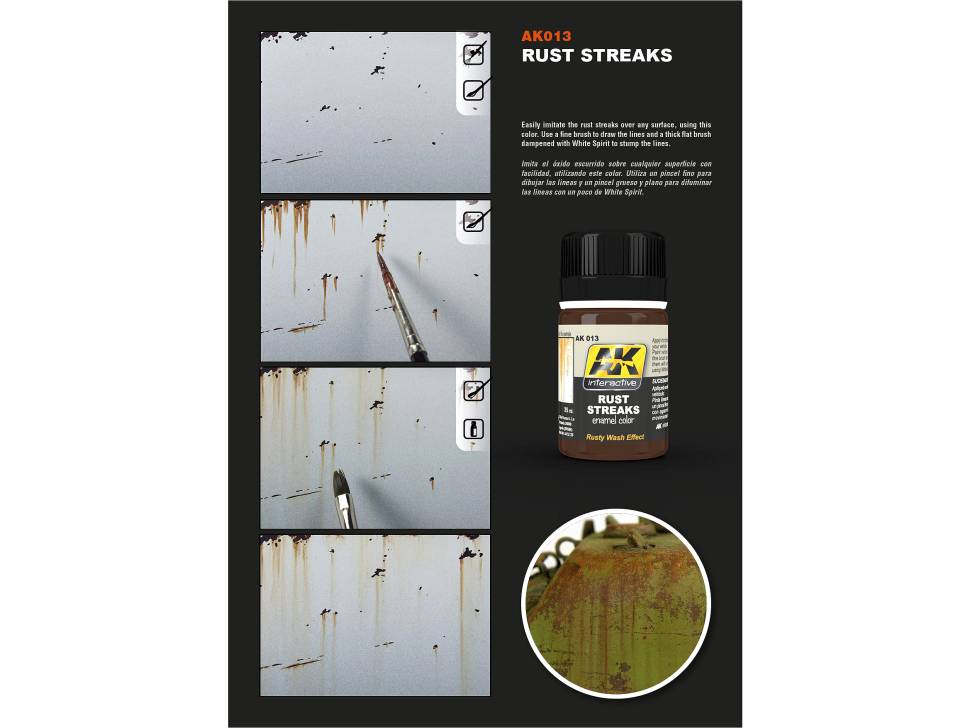 Эмалевая смесь красновато-коричнего оттенка, идеально подходит для создания реалистичных полос и пятен ржавчины и коррозии. Хорошо встряхнуть перед использованием. Нанесите тонкой кистью неправильными вертикальными линиями, и дайте краске подсохнуть примерно 10 минут. Затем возьмите плоскую кисть, смоченную растворителем для эмали, и проведите с небольшим нажатием по ранее нанесенной полосе, чтобы смягчить эффект и создать естественный вид.