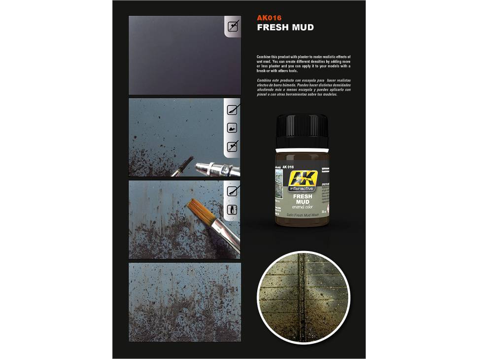 Эмалевая смесь, имитирующая натуральную свежую грязь. Идеально подходит для создания грязных поверхностей. Просто нанесите ее на колеса, гусеницы или корпус вашей модели, чтобы добиться максимально реалистичного результат. Если вы хотите придать больше объема, вы можете смешать этот продукт с гипсом. Перед использованием хорошо взболтать. После нанесения растушуйте смесь, используя широкую плоскую кисть, смоченную растворителем для эмали.