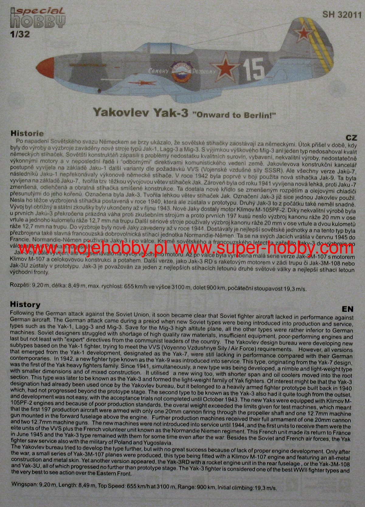SPECIAL HOBBY SH 32011 САМОЛЕТ ЯКОВЛЕВ ТИП 3 "ONWARD ON BERLIN" /ИСТРЕБИТЕЛЬ/ 1/32
