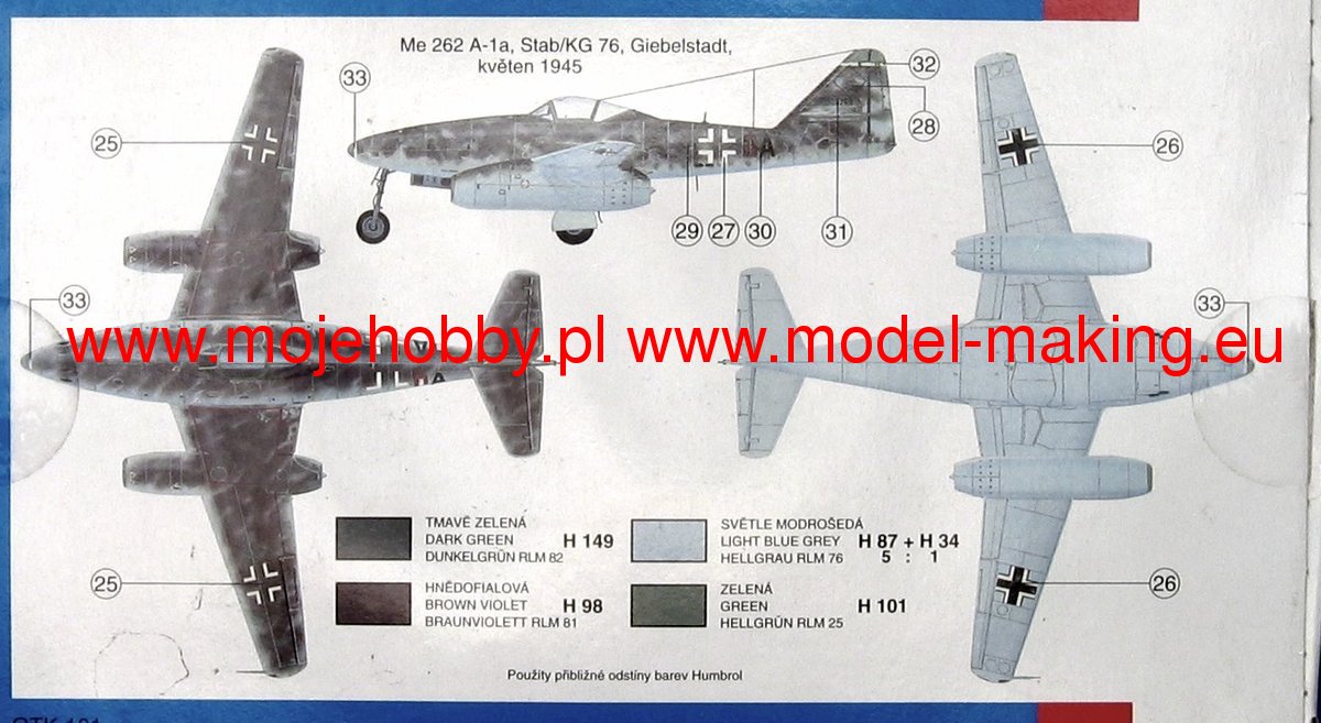 The Messerschmitt Me-262A Schwalbe (German: swallow) is a German twin-engine fighter-bomber with a metal structure in a low wing configuration. The Me-262 was the first combat jet in the history of aviation. The first flight with piston engines took place in 1941, and with turbojet engines on July 18, 1942. The first design of the airframe, designated P.1065, was presented in 1939 and, surprisingly, differed significantly from the final version. It was quickly decided to use oblique wings and test the airframe in flight with piston engines (Jumo210), which was successfully completed in 1941. As a result of problems with the target power unit (BMW003 engine), the first jet flight on the Me-262 took place with Junkers Jumo004 engines. Interestingly, the Me-262 was structurally ready for serial production at the end of 1942. However, his entry into the line was significantly delayed. Firstly, due to material deficiencies (especially tungsten and chrome deficiencies), which forced technological changes, secondly, because of the failure of the BMW003 engines, and third, because of Hitler's resistance to the Me-262 being a fast bomber, not a fighter. As a result of all factors, the plane entered the line only in 1944! Given the already overwhelming advantage of the Allies in the air, the shortage of fuel and trained crews of the Me-262 could not have had a major impact on the course of the war. Undoubtedly, it was technologically superior to enemy aircraft, and the loss ratio was 1: 9 in favor of the Me-262. A total of about 1,400 machines were built, but only about 300 entered service. Several development versions of this revolutionary aircraft were created: a bomber (A-2a), reconnaissance (A-1a / U3 and A-4a), day fighter (A-1a) and night fighter (B-1a / U1). Technical data (version Me-262A-1a): length: 10.6m, wingspan: 12.6m, height: 3.5m, maximum speed: 900km / h, speed of climb: 20m / s, maximum range: 1050km, ceiling maximum 11450m, armament: fixed - 4 30mm MK108 cannons, underslung - 24 R4M rockets, 55mm caliber, up to 1000 kg of bombs.