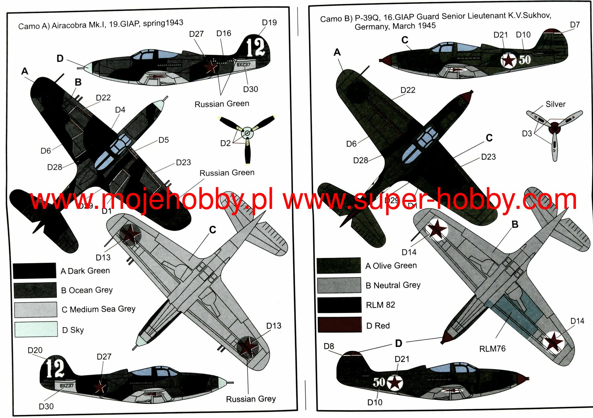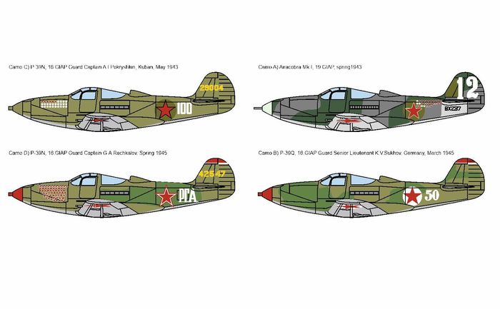 The Bell P-39 Airacobra is an American, single-engine, metal fighter plane with a classic tail in the low wing configuration with a three-wheeled undercarriage. The flight of the prototype took place on April 6, 1938, serial production was carried out in 1940-1944. Despite its conventional appearance, the Bell P-39 Airacobra was a unique design among US Army fighters during World War II, the first with a front wheel. This solution was dictated by the need to install heavy weapons in the nose part of the aircraft, which in turn corresponded to the expectations of the mid-1930s related to ensuring high firepower. In early 1935, the management of Bell Aircraft Corporation was present at the demonstration of the American Armament Corporation - T9 caliber 37 mm. Stunned by the results of the show, it led to the commencement of construction work on a fighter plane using a T9 cannon firing through the propeller hub and additionally equipped with two 12.7mm machine guns installed in the nose part of the fuselage and synchronized with the rotation of the propeller. The decision made to locate the cannon in the nose of the machine imposed the placement of the engine inside the fuselage. The propeller was driven by a long shaft located under the cabin floor. Such an installation of the engine, almost exactly in the center of gravity of the aircraft, entailed the need to use a three-wheeled undercarriage with a front wheel. The first major order for the 369 P-39 was placed in September 1940, and shipments began approximately seven months later. At the same time, the first export units ordered by the British began to leave the production line. They were to replace the worn-out Hawker Hurricane machines. Ultimately, however, the largest foreign recipient turned out to be the Soviet Union, which received about 4,700 aircraft, where the total number of assembled P-39s of all versions slightly exceeded 9,500. Technical data (P-39Q version): length: 9.2 m, wingspan: 10 , 4 m, height: 3.8 m, maximum speed: 605 km / h, speed of climb: 19 m / s, maximum range: 840 km, practical ceiling: 10700 m, armament: fixed - 4 7.62 mm M1919 machine guns, 2 machine guns M2 12.7mm caliber and 1 M4 37mm cannon, suspended - up to 230 kg of bombs.