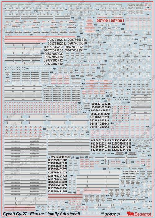 Полный набор технических надписей на один самолет типа Су-27 (ранних или поздних производственных серий) или Су-27УБ (ранних или поздних производственных серий) или Су-33 и подвесное вооружение на любой самолет семейства Су-27 (40 типов ракет "Воздух-Воздух", "Воздух-Поверхность", НАР, блоки НУРС, контейнеры наведения и дозаправки, свободнопадающие и корректируемы авиабомбы. Комплект содержит четыре листа деколи большого размера и инструкицию на 4-х листах формата А3. Комиссионный товар