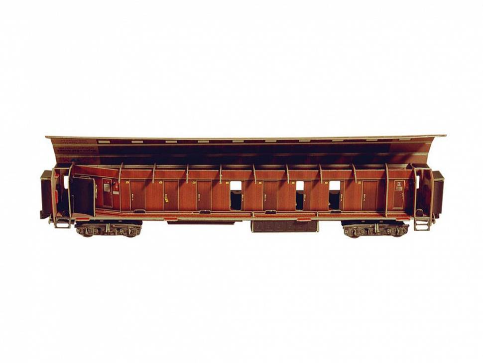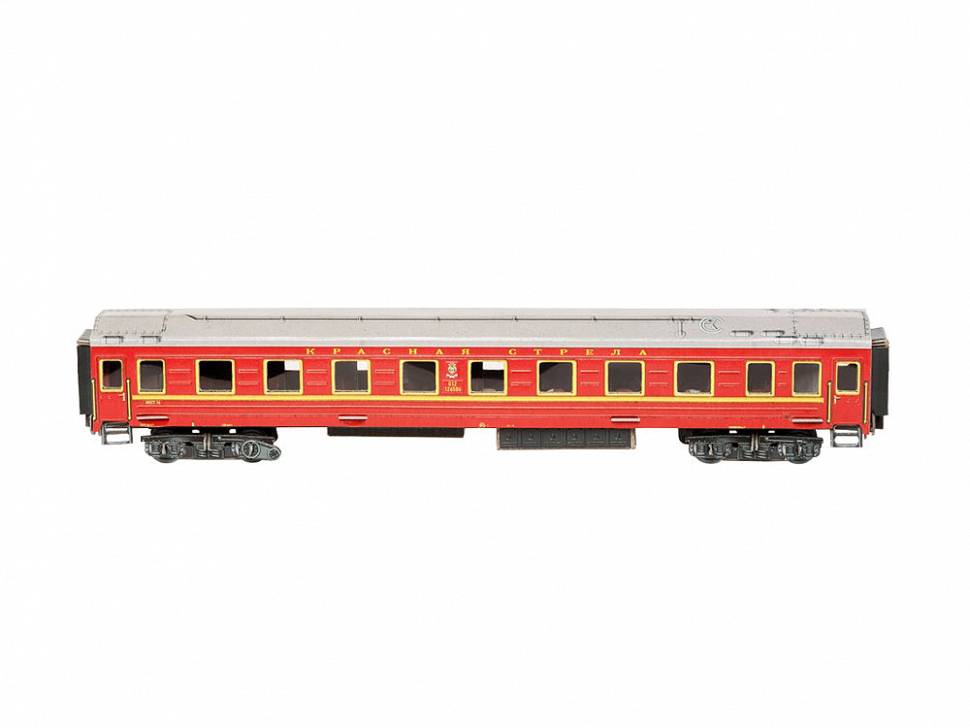 Спальный вагон "Красной стрелы" скорого поезда, курсирующего между Москвой и Ленинградом. Конструкция вагона была обычной для советских пассажирских вагонов, а все остальное отличалось. Поезд "Красная стрела" начиная с 1960-х отличается от остальных поездов, ожидающих своих пассажиров на соседних путях вокзала, в первую очередь цветом своих вагонов. Вагоны других поездов были зеленые, а этот красный. Модель может быть установлена на стандартную модельную колею 1/87. Хотя колеса вагона не вращаются, это не портит впечатления, собранная модель смотрится эффектно и реалистично. Особую привлекательность ей придает объемная текстура, выполненная на внешней поверхности. В процессе сборки можно рассмотреть детали интерьера вагона. После окончания работы над моделью можно рассматривать помещения спального вагона сквозь окна. Для сборки модели не понадобятся режущие инструменты или клей. Детали уже вырезаны и нужно просто вынуть их из листа картона и соединить между собой. Основной материал модели прочный двусторонний картон толщиной 1 мм, в наборе присутствуют и детали оконных стекол из тонкого пластика. Количество деталей - 59 Сложность сборки - 2 Размер - 29х4х5.5 см
