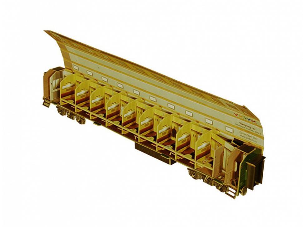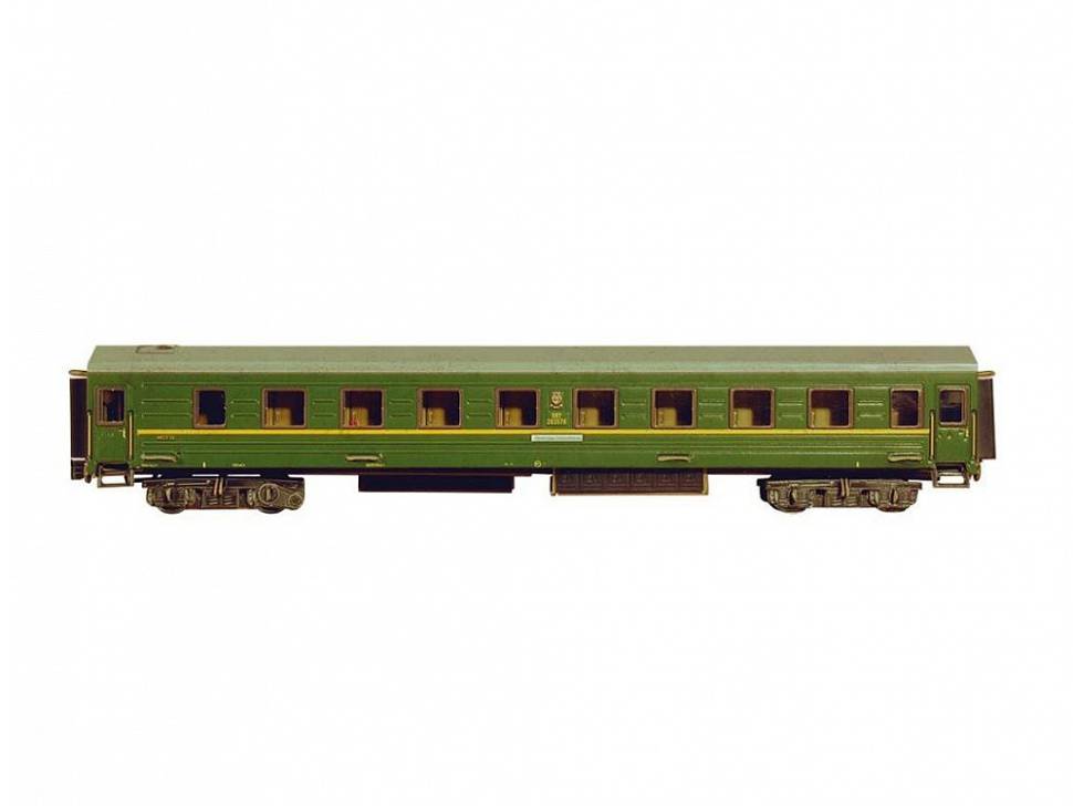 До недавнего времени каждый пассажирский поезд дальнего следования состоял из таких вагонов. Зеленый цвет был традиционным как при окраске вагонов пригородного сообщения, так и для спальных вагонов. Маршрут вагона был указан на эмалированной металлической табличке, которая подвешивалась снаружи. Спальный вагон внутри разделялся перегородками на отдельные четырехместные купе, двери которых выходили в коридор. Двухместное купе проводников находилось в том конце вагона, где помещался титан для кипячения воды. Для разогрева воды в пути титан топился углем. Модель не предназначена для открывания и закрывания. Интерьер вагона можно рассмотреть в ходе сборки, а после окончания сборки модели - только сквозь окна. Несколько дверей между купе и коридором вагона выполнены открытыми, в этих местах вагон сквозь окна просматривается насквозь. Стендовая модель соответствует колее 16,5 мм, ее можно установить на стандартные рельсы масштаба 1/87 (H0). Колеса, к сожалению, не крутятся, но общего впечатления это не портит. Аккуратно собранная модель удивит любого зрителя. С двух шагов невозможно даже предположить, что модель выполнена из картона! Детали оконных стекол из тонкого прозрачного пластика также входят в набор. В наборе присутствует дополнительная картонная деталь сцепки для соединения модели с другими вагонами производства "Умная бумага". Вагоны соединяются вполне надежно и весь состав можно передвигать за локомотив. Для сборки модели не понадобятся режущие инструменты или клей. Детали уже вырезаны и нужно просто вынуть их из листа картона и соединить между собой. Количество деталей - 59 Сложность сборки - 2 Размер - 29х4х5.5 см