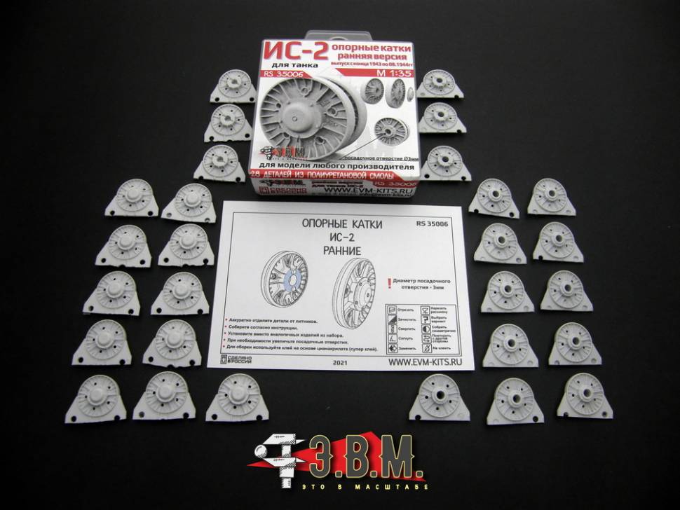 Такие опорные катки, с приливами под болты крышки ступицы, ставились на танки ИС-1 и танки ИС-2 выпуска до (примерно) августа 44-го.Для наборов Dragon 6012, Dragon 6052, Cyber Hobby 9108, Trumpeter 05587, Trumpeter 05588.Для любых конверсий ИС и ИСУ, на базе моделей Звезда, Дрэгон, Трумпетер, Тамия, в образцы техники до середины 44-го года.В комплекте 14 пар катков, 12 опорных и 2 пары ленивцев. Набор универсальный, диаметр посадочного отверстия 3мм.