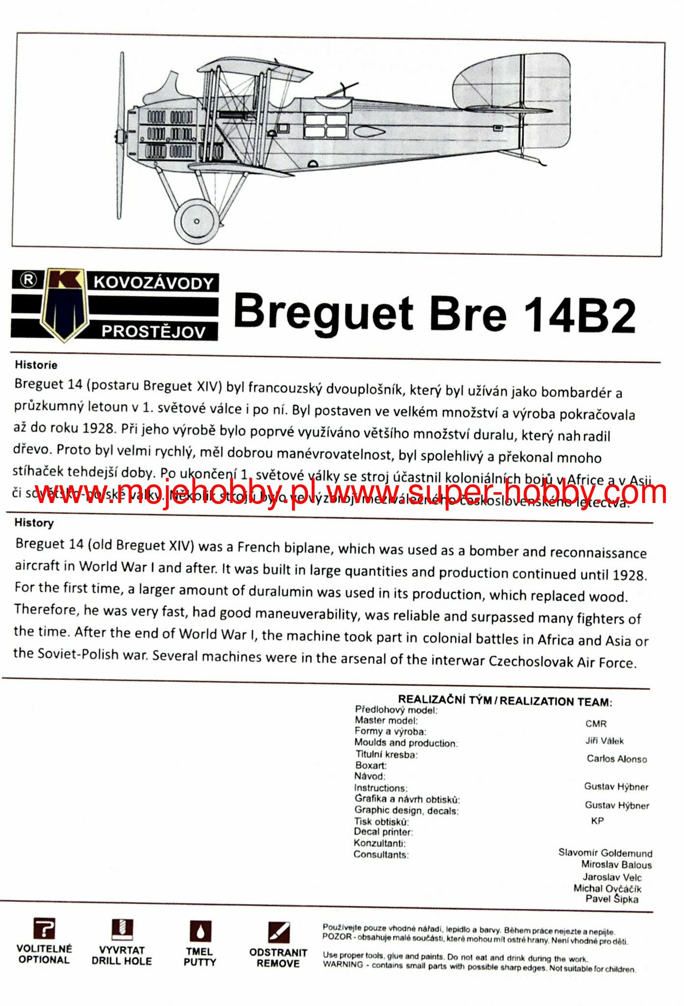 The Breguet 14 (or Breguet XIV or Bre.14) was a French reconnaissance aircraft and light bomber from World War I and the interwar period. The machine was built in a biplane system, it had a mixed structure and a classic - fixed undercarriage. The prototype flight took place in 1916, and serial production started in 1917. Approximately 8,000 aircraft of this type of all versions were created during it. The drive - in the B2 version - was provided by a single engine Renault 12Fe with a power of 300 hp. The deck armament consisted of three 7.7 mm machine guns. The machine could carry a load of bombs weighing up to 300 kilograms. The Breguet 14 was developed by Louis Breguet in response to the requirements set by the French military aviation for a new light bomber plane. The machine marked the return of this great aviation constructor to the plane with a towing propeller, as well as the large-scale use of duralumin, which was a novelty among aviation constructions of that time. The machine also had good flight range and performance. It is widely recognized as one of the best light bombers of the First World War. In the course of serial production of this successful aircraft, many of its development versions were created, including: Bre.14 A2 (reconnaissance version), Bre.14 B2 (bomb version) or Bre.14S (sanitary version). Airplanes of this type were used, inter alia, in the military aviation of Belgium, Spain and Poland. The last copies of this aircraft were withdrawn from the Polish airline service by 1932.