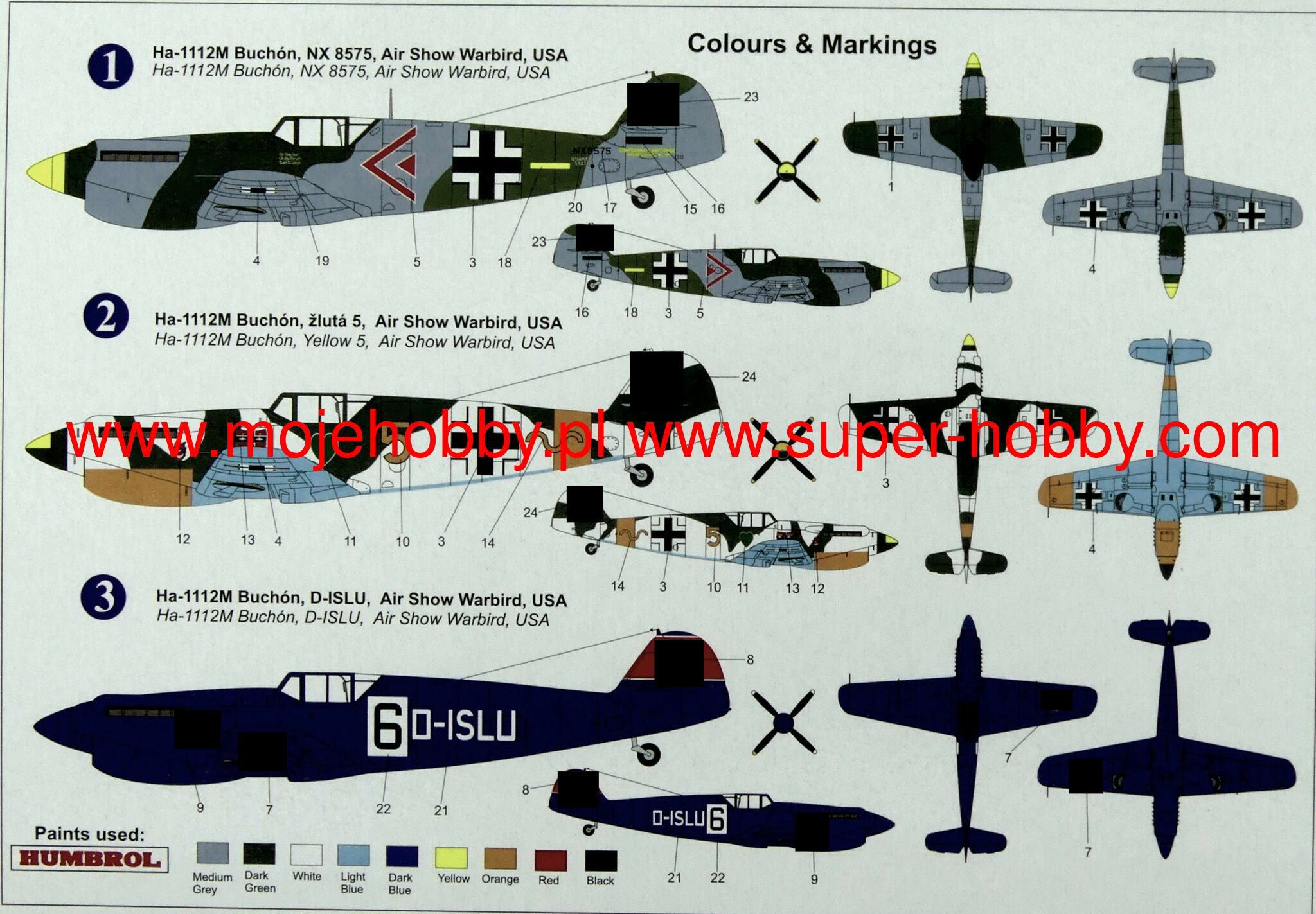 Hispano-Aviacion HA-1112 is a licensed Messerschmitt Me-109G-2 fighter plane. Originally, the Spanish machine was to be powered by a Mercedes-Bezn DB605A engine, but due to the inability to deliver a sufficient number of them, Hispano-Suiza 12Z-89 engines with a capacity of 1300KM were mounted on the serial aircraft. The first HA-1112 with such an engine took to the air in 1944. However, it did not have a satisfactory performance, which led to the creation of the HA-1112M1L version with the Rolls-Royce Merlin 500-45 engine with 1600HP. The flight of this machine took place only in 1954 and became the basis for mass production, which included 172 machines of this version. The plane was sunk from 1965. Technical data: length: 8.49 m, wingspan: 9.92 m, height: 2.6 m, maximum speed: 665 km / h, rate of climb: 28.3 m / s, maximum range: 765 km, maximum ceiling 10,200 m, armament: permanent -2 20mm Hispano-Suiza cannons, slung for 8 80mm Oerlikon unguided missiles.